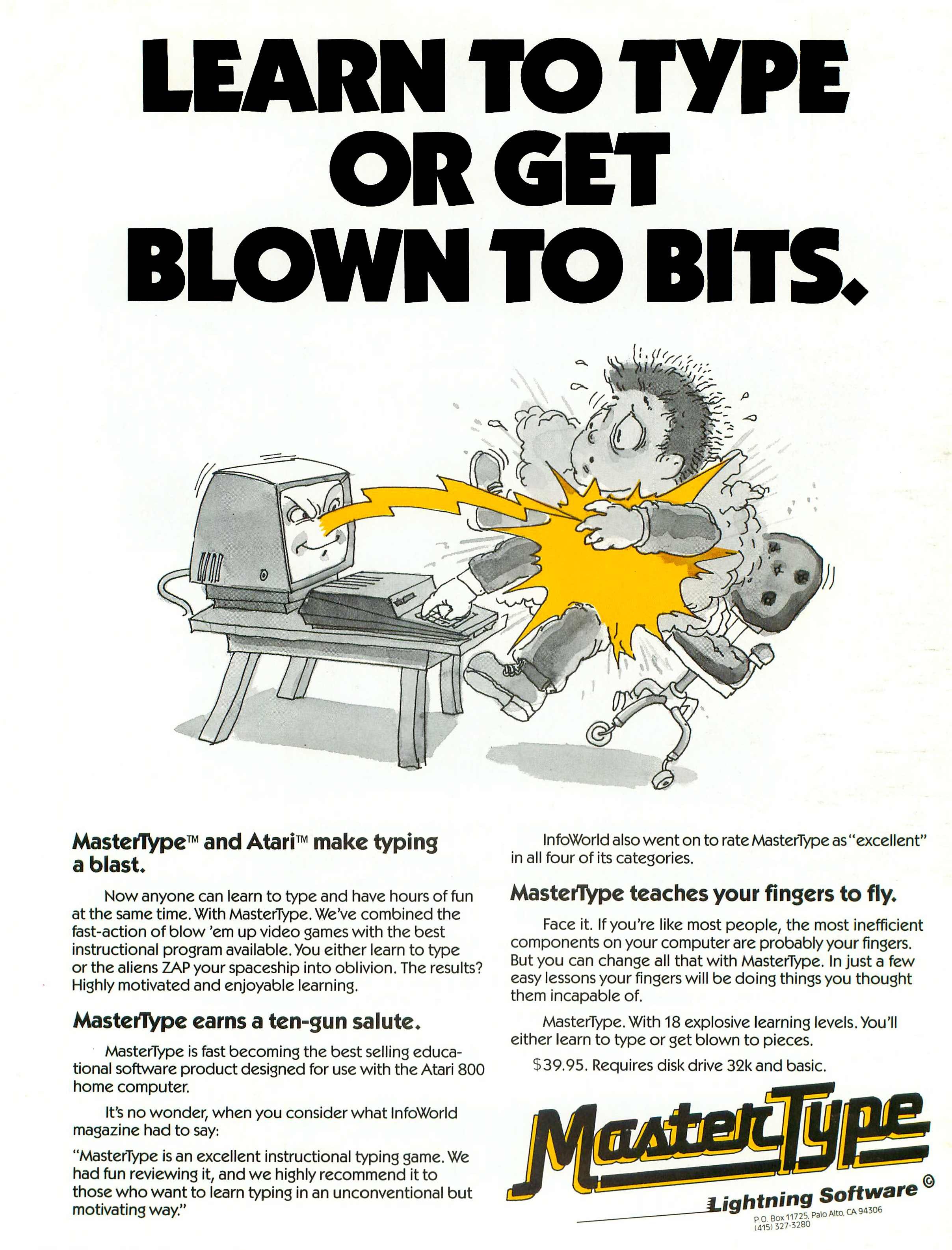 Ha egy kicsit megkapargatja a felszínt az ember, rengeteg eredeti, újító ötletről derül ki, hogy azt valaki 15 évvel korábban már szinte ugyanúgy megcsinálta. Legújabb példám erre a Typing of the Dead, amelyről én azt hittem, hogy a WOW stúdió remek új ötlete volt: egy akciójáték, ahol célzás helyett gyors és pontos gépeléssel lehetett zombikat irtani. Ehhez képest itt van ez az 1982-es program, amely lényegében ugyanezt tudja, csak épp nem egy House of the Dead 2-paródia, hanem egy Space Invaders-szerűség.