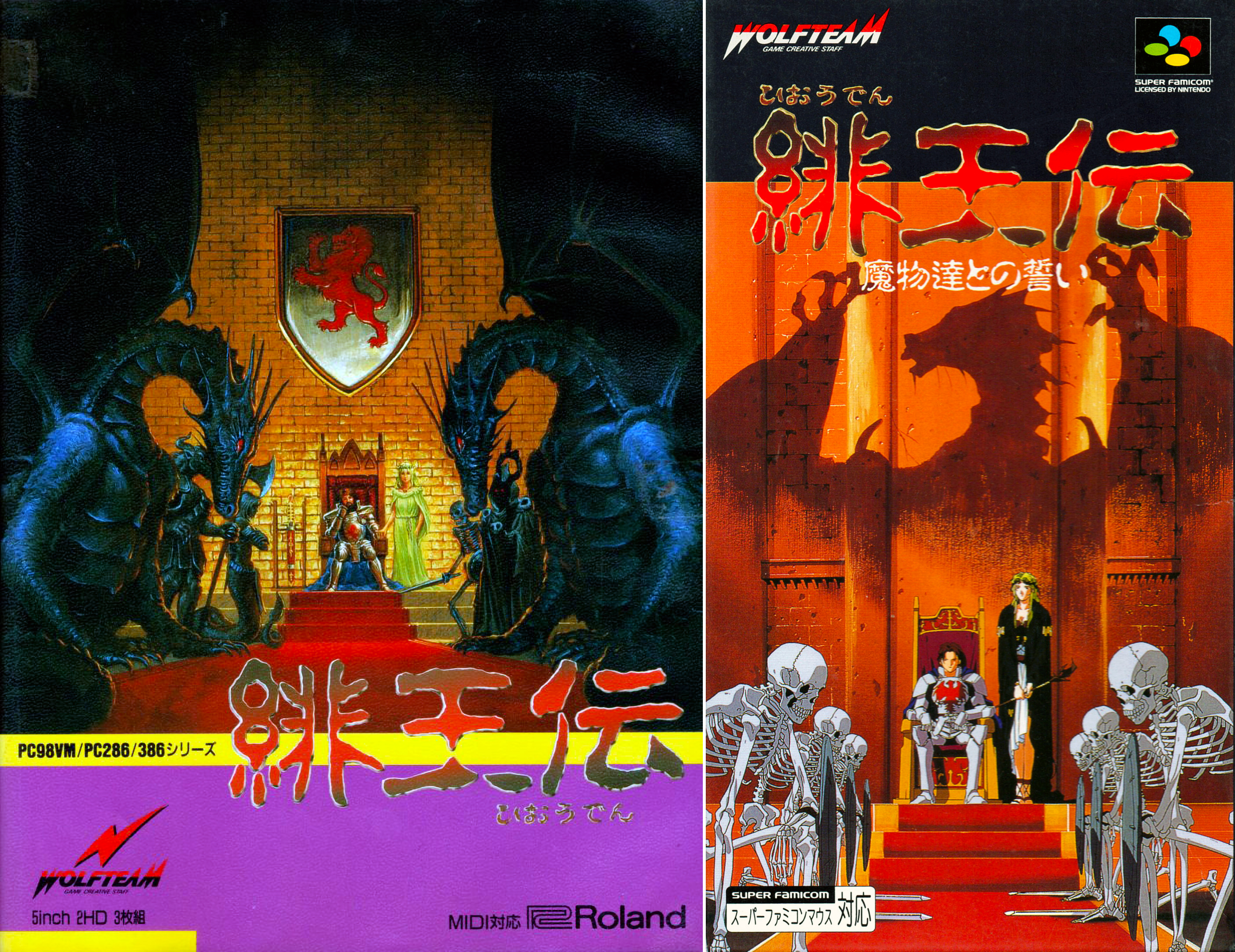A Hiouden PC-s, illetve két évvel később megjelent Super Famicom-változatának borítói – a trónterem eltéréseiért a program eseményei tehetők felelőssé, de a párhuzamok így is igen tetszetősek. Sajnos rajongói fordítás csak az utóbbi verzióhoz létezik, márpedig egy ilyen valós idejű RPG-t az irritálóan lassú kontrolleres kurzorral birizgálni nem valami nagy öröm – egérrel sokkal élvezetesebb a kicsit talán a Cannon Fodderekre emlékeztető, csak persze fantasy lényekkel és karakterfejlődéssel teli játék.