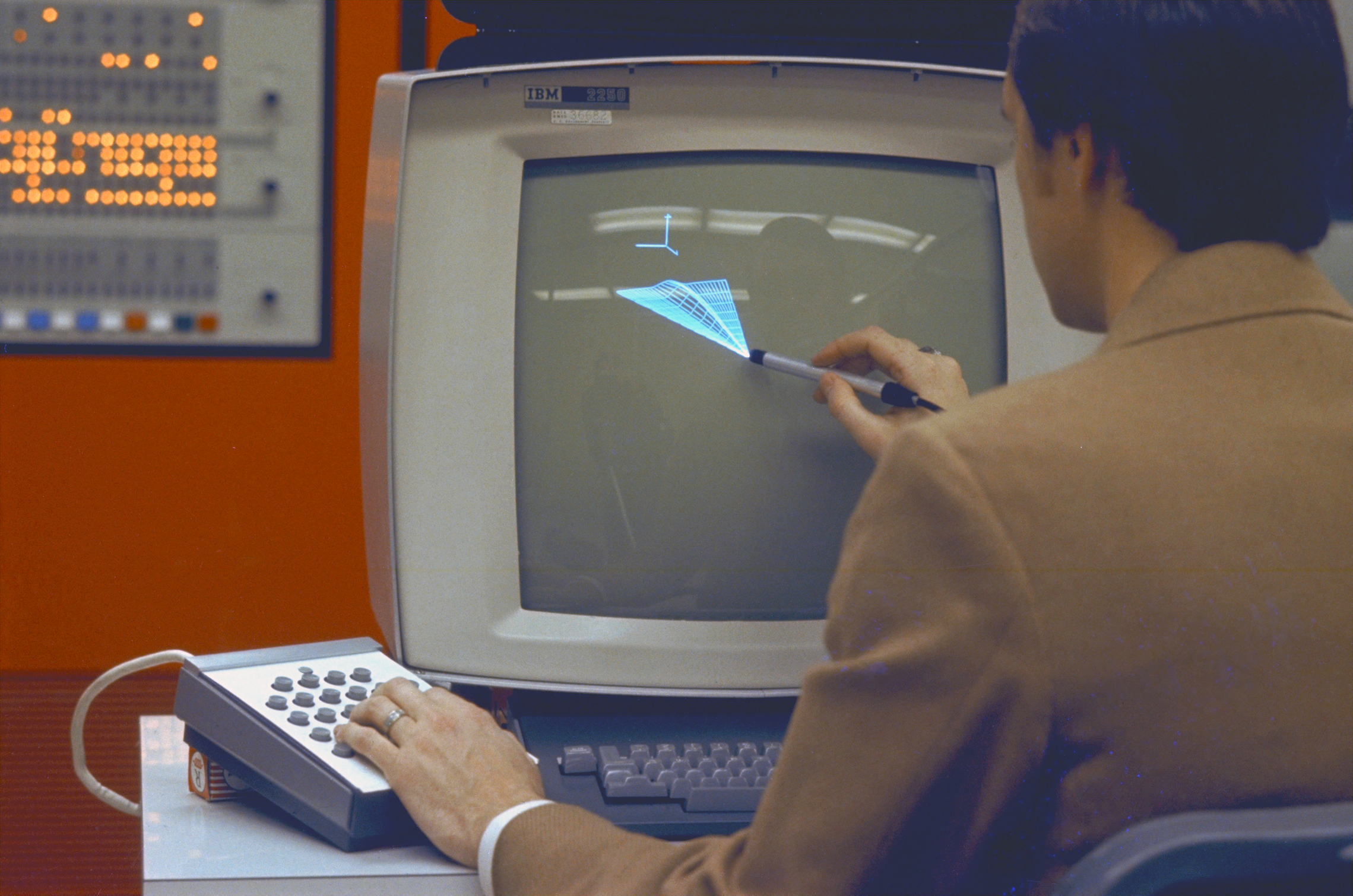 Dr. Paul Kutler, a NASA egyik áramlástan-specialistája 1978 februárjában egy IBM 2250 terminálon végez kísérleteket a nagy sebességgel haladó járművek és a légellenállás témájában. Igaz, a cukorkásdobozzal (?) alátámasztott keyset nem a legelegánsabb, de a fényceruza  tényleg roppant menő!