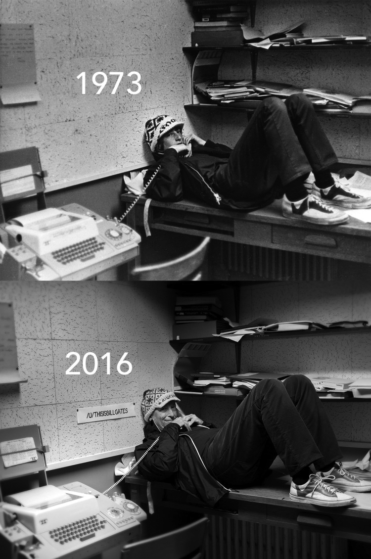 Bill Gates a gimnáziumi évkönyvében, illetve Bill Gates, aki egy Reddit AMA (ask-me-anything, lényegében egy nyilvános interjú) kedvéért megdöbbentően igényesen rekreálta a fotót 43 évvel később.