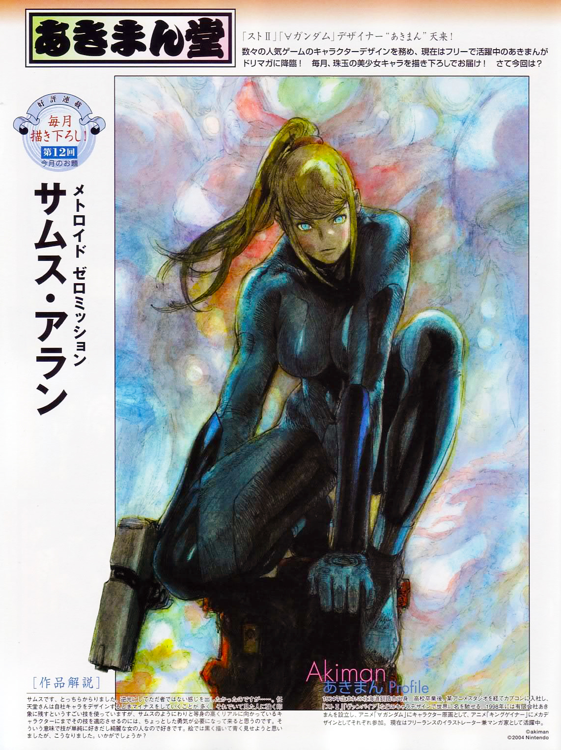 A Capcom legendás grafikusa, Akiman néha másoknak is festett egy-egy karaktert – itt például a Metroid: Zero Mission kapcsán megrajzolt Samus Aran látható a Zero Suitben. Ahogy látható, a művész lelkesedése a fitosnál is fitosabb orrok és az igen izmos combok iránt Chun Li megalkotását követően sem lohadt le...