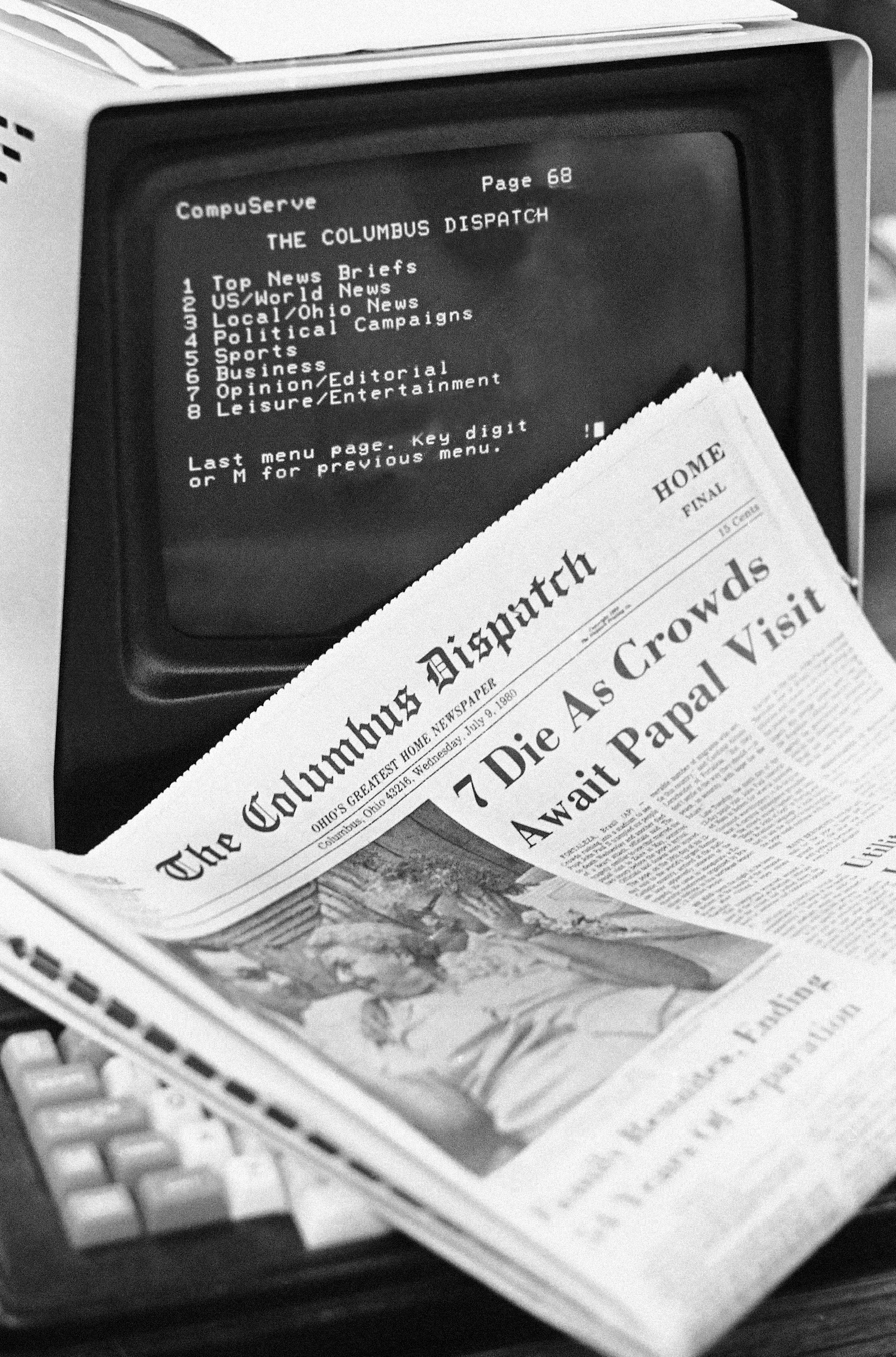 „A pápa lemészárolt hét embert!” – és a hírt már nem csak papíron, de monitoron is lehet olvasni. Az oldalon már többször megemlített CompuServe már 1980-ban sok más funkció mellett hírportálként is működött a modem-tulajdonos kevesek számára.