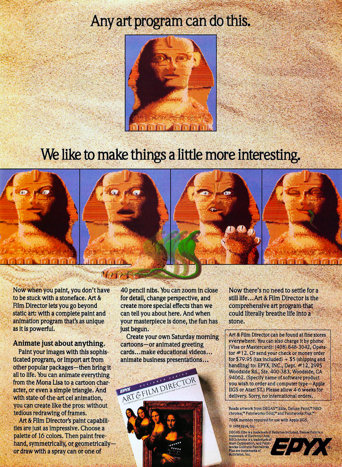 Miután Dan Silva programozónak köszönhetően az Electronic Arts meghódította az amigás világ kreatívabb szekcióját a Deluxe Paint rajzolóprogrammal, minden rivális hasonló eszközök gyártásába fogott. És mivel a Deluxe Paint II messze legismertebb, a megannyi magazin-címlap miatt ikonikussá vált képe egy fáraót ábrázolt, majd’ mindenki megpróbálkozott valami egyiptomi design szerepeltetésével. Ha nem a program promociós képein, hát a reklámokban, mint ahogy azt itt tette az Epyx is új rajzprogramuk, az Art & Film Director népszerűsítése közben.
