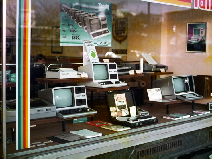 Egy nyugatnémet számítógép-üzlet kirakata 1984-ben, amikor a Commodore helyett még a Tandy uralkodott.