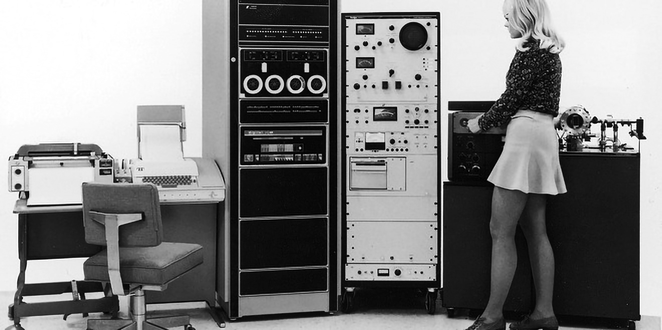 A hölgy mögött egy teljes Finnigan Instrument Model 1015 GC/MS/DS rendszer áll, vagyis balról jobbra egy számítógép nyomtatóval, a duplaszekrény-méretű kvadrupól tömegspektrométer, annak vezérlőkonzolja, illetve egy gázkromatográf.