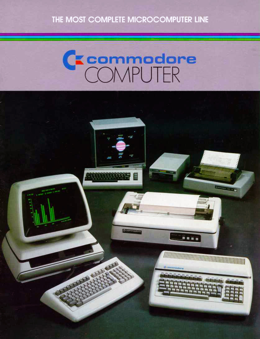 A Commodore 1982-es amerikai termékkatalógusának címlapja. A legtöbb modell valószínűleg idegen a magyar felhozatalt ismerők számára, hisz ezeket az elsősorban munkára szánt, a CBM, azaz a Commodore Business Machines vonalba tartozó gépeket itthon nem nagyon forgalmazták. Az előtér bal oldalán például egy Commodore 700, jobb alul pedig egy Commodore 610 modell figyel – ezekből igen kevés jutott el a vasfüggöny mögé.
