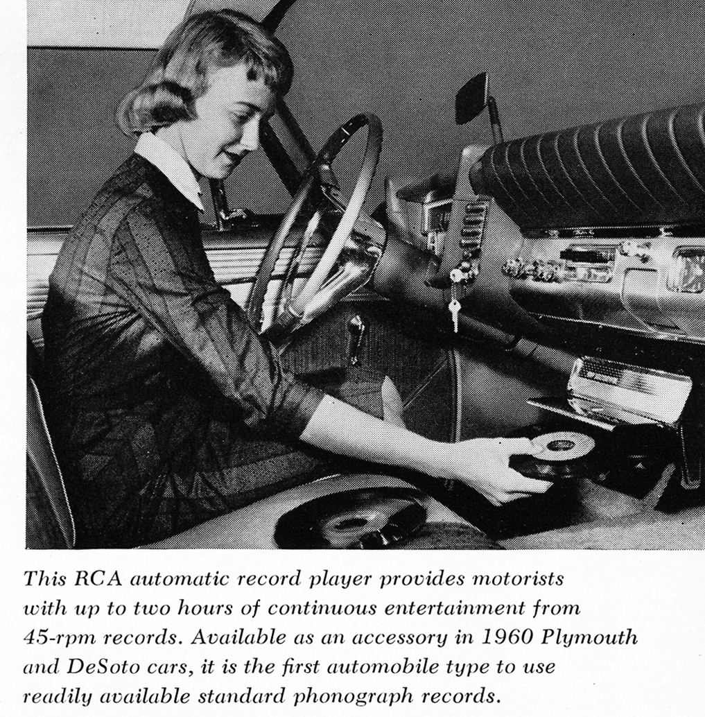 Valamiért soha még csak eszembe se jutott, hogy bakelitlemezt is biztos lehetett autóban hallgatni, így ez a hirdetés szinte sokkoló erejű volt. Vajon kátyúkkal teli utakon miként működött egy ilyen lejátszó...? A kép az RCA egyik prospektusában, 1959 legvégén jelent meg.