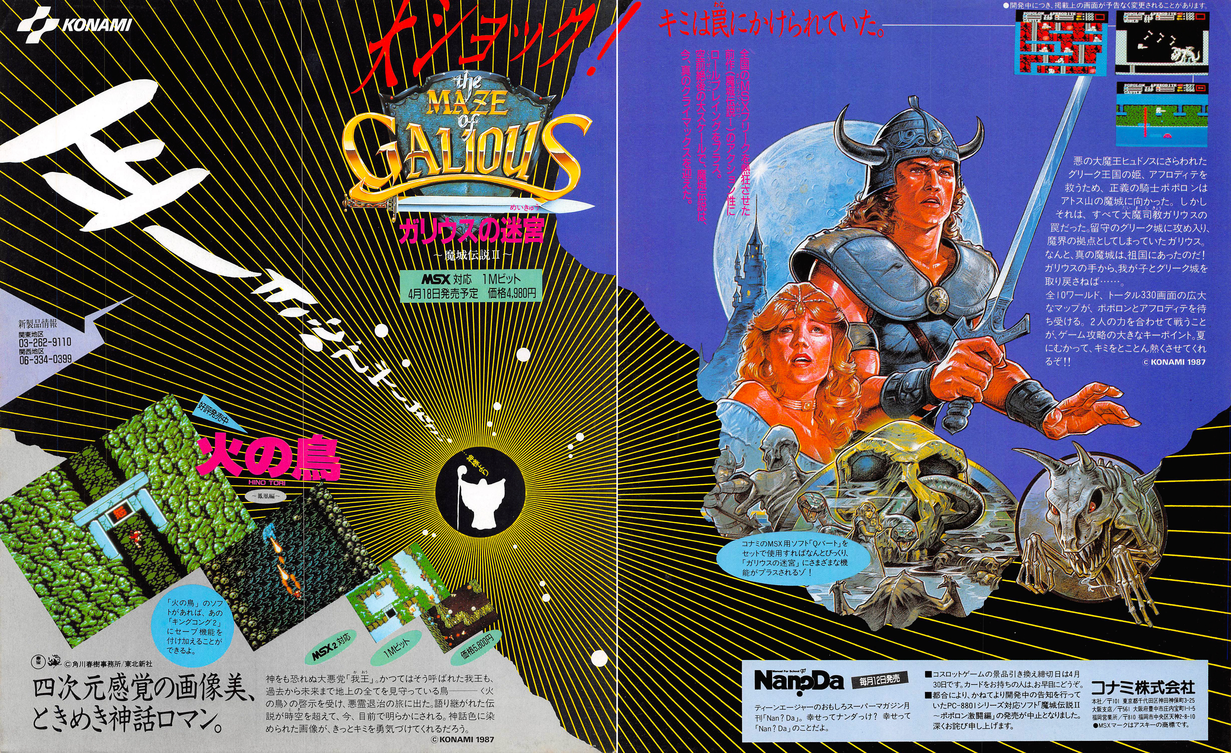 A retinaégető reklám a Knightmare-trilógia középső tagját, a The Maze of Galioust próbálja bemutatni – igaz, az örökséget nem hangsúlyozza ki, mégpedig feltehetően a totális stílusváltás miatt nem. Míg az első rész egy vertikális shoot ’em up volt, csak épp űrhajó helyett egy lovaggal, addig a második rész egy oldalnézetes akciójáték lett, nagyjából a Zelda II mintájára. Az eredeti vonalat inkább a bal alsó sarokba beszuszakolt bónusz hirdetés alanya, a Hi no Tori vitte tovább, a játék, ami egy kevésbé ismert Osamu Tezuka-manga alapján készült.