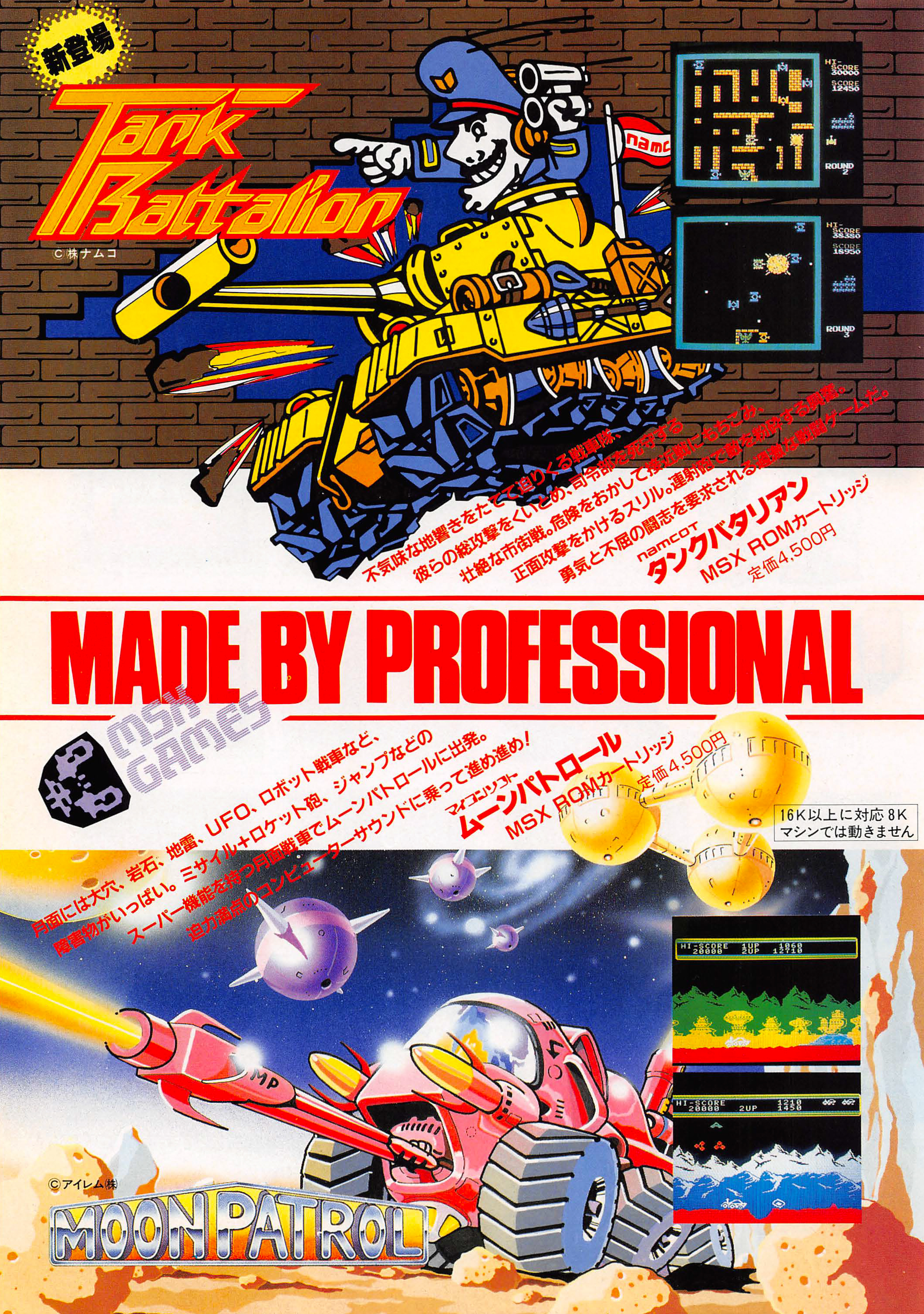 Az MSX annyira hobbiszámítógép volt, hogy a gép első éveiben még külön volt értelme hirdetni, hogy melyik játékot készítette profi kiadó. Igaz, talán nem ártott volna egy angol nyelv terén is profi szakembert megkérni a háromszavas mondat lektorálására, de hát biztosak lehetünk benne, hogy a legtöbb olvasónak nem tűnt fel a mondat kacskasága. A hirdetés amúgy az MSX-szabványt menedzselő ASCII műve volt, azért kerülhetett rá két eltérő kiadó terméke is: a Tank Battalion a Namcot, a Moon Patrol e verziója pedig a Dempa Micomsoft játéka volt.