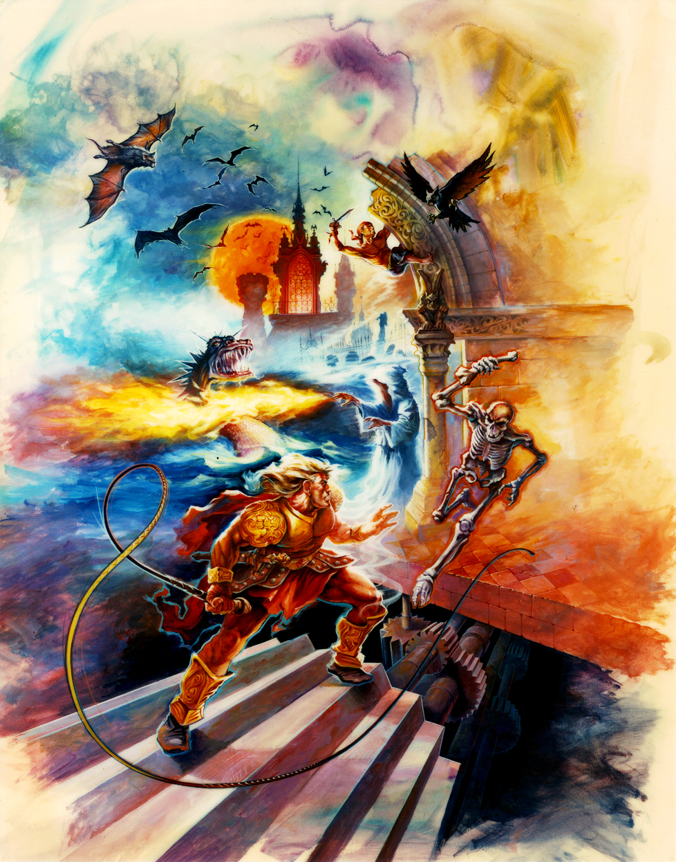 A Castlevania III: Curse of Dracula nyugati dobozképei ezt a nagyszerű festményt használták fel. A grafikus Tom DuBois volt, akinek láthatóan megmutatták a játékot, hisz a képen nem csak ikonikus helyszínek és főellenfelek tűnnek fel, de a főszereplő három potenciális szövetségese is megjelenik. Sajnos a borítóra az egész festmény nem fért rá, így az végül így nézett ki. Csak az összehasonlítás végett: ez volt az eredeti japán dobozkép.
