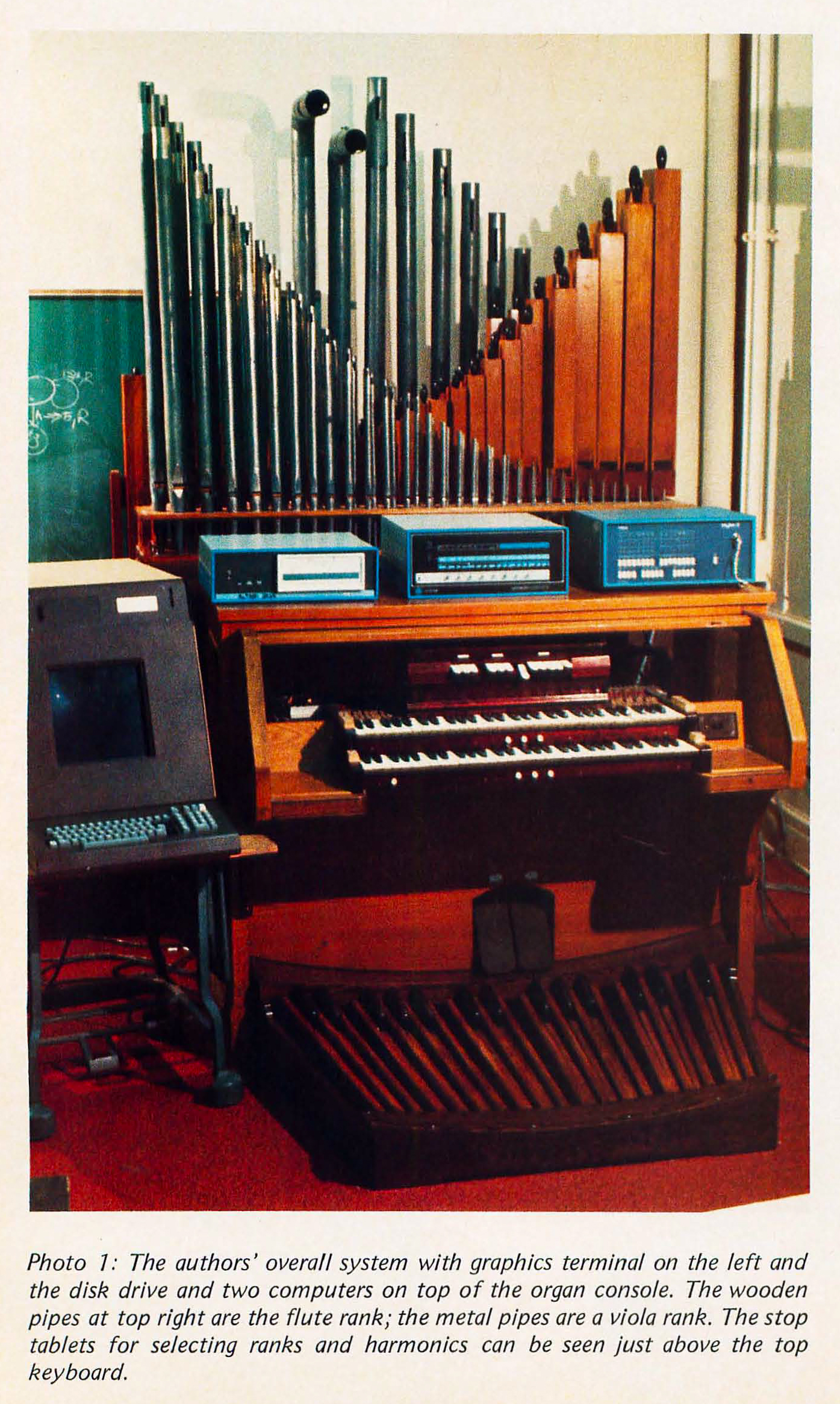 Mielőtt úgy igazán beköszöntött volna a digitális zene korszaka, a számítógépeket a komplexebb analóg hangszerek irányítására használták fel a zenerajongó programozók. Az itt bemutatott fura gépezet a University of Pittsburgh egyik laborjában készült, és az orgona mellett egy Altair 8800b, illetve egy Intellec 8/MOD 80 számítógép tartozik hozzá. A bal szélen levő „buta” terminál csak az irányításra szolgál, saját számítási teljesítménye nincs;azt a munkát a kék Altair-gépek végezték. A konstrukcióval a direkt e célra írt MUSIC programozási nyelvet használva írt nóták megszólaltatása volt lehetséges.