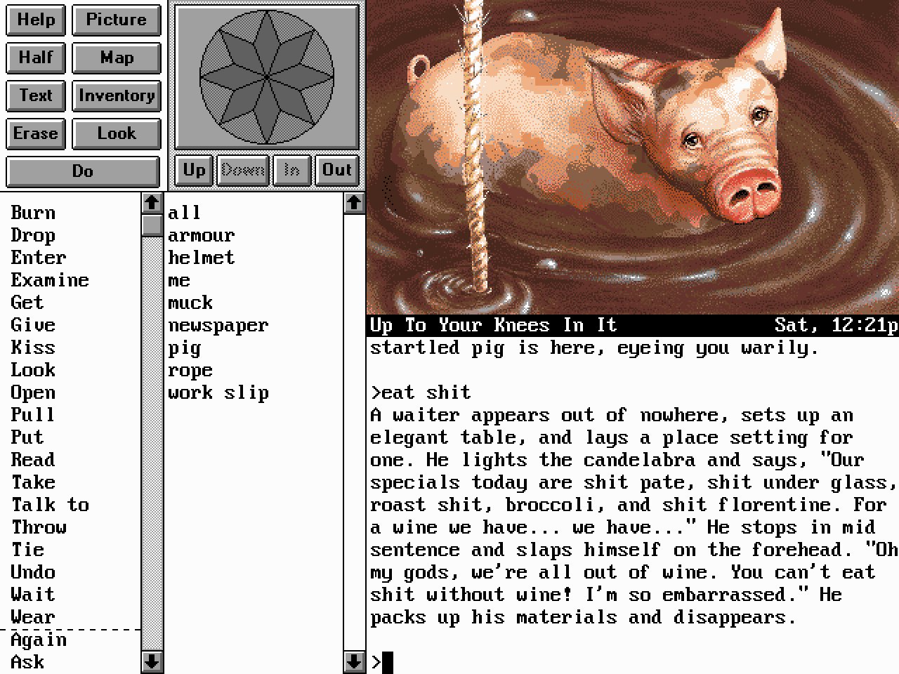 Az 1993-as Eric the Unready egyike volt az utolsó nagy költségvetésű és minőségi szöveges kalandjátékoknak. Bár illusztrációk voltak benne, ezek tényleg azok voltak: állóképek, amelyek adtak némi támaszpontot az események elképzeléséhez, de a karakter soha nem látszott a monitoron, sőt, a képeket ki is lehetett kapcsolni, ha nagyobb szövegmezőre vágytunk. A játék legjobb pontja az volt, mint megannyi más remek szöveges kalandjátéknál: a kiválóan működő szövegértelmező, illetve a nagyszerűen megírt szövegek. A tesztelés során több ezer, a végigjátszás szempontjából hibás, de a tesztelők által kipróbált parancs kapott humoros reakciókat – és persze a kép is egy ilyet mutat.