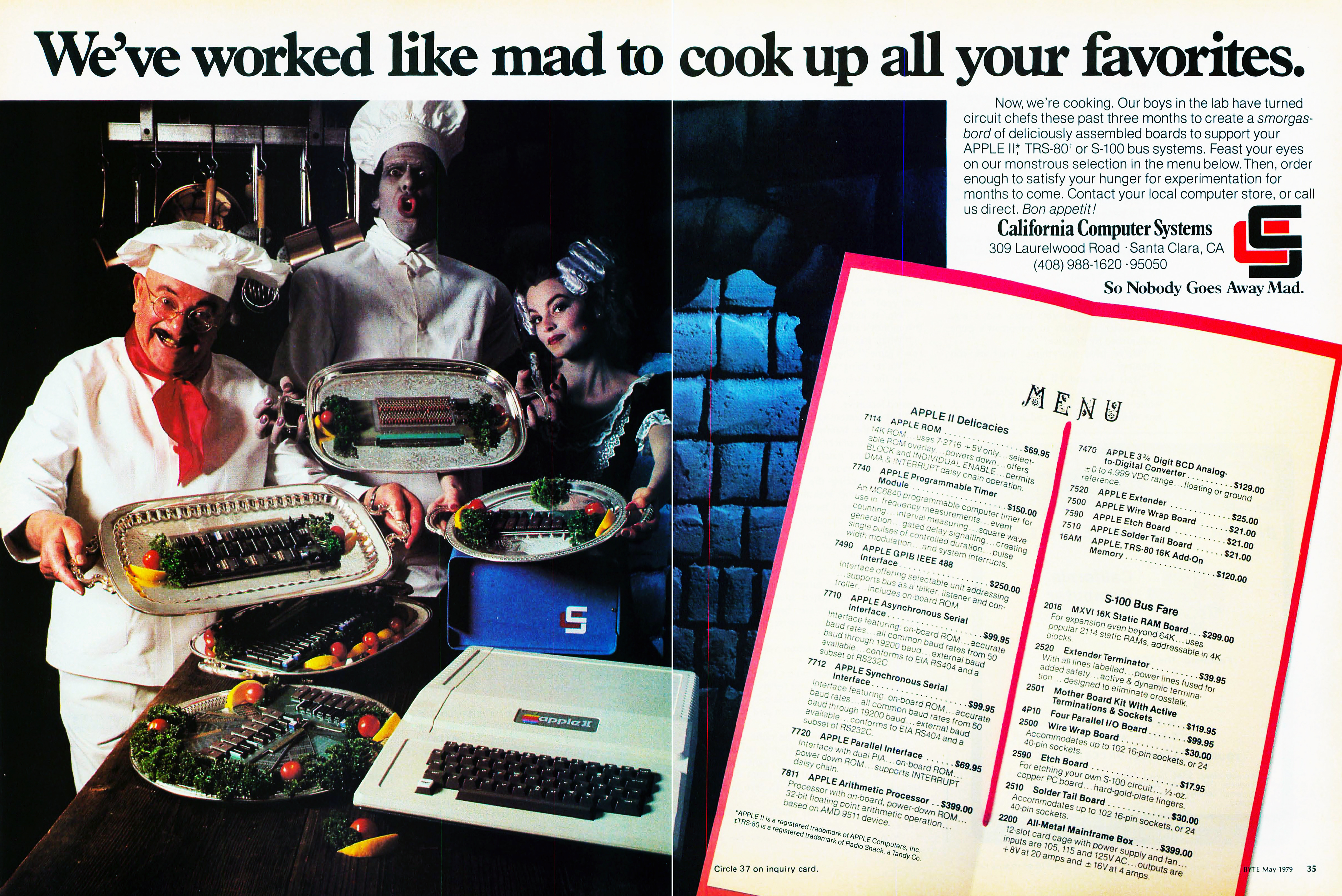 Nem tudom, eredményes volt-e ez a meglehetősen bizarr hirdetés, és hogy az áramkör-szakácsos körítéshez miért volt feltétlenül szükség egy blackface-t viselő Frankenstein-szörnyetegre is, mindenesetre az étlap is bizonyítja, hogy hiába a már szép házba rakott, készen kapható Apple II, 1979 bizony még erősen a házilagosan forrasztott-kábelezett számítógépek korszaka volt.