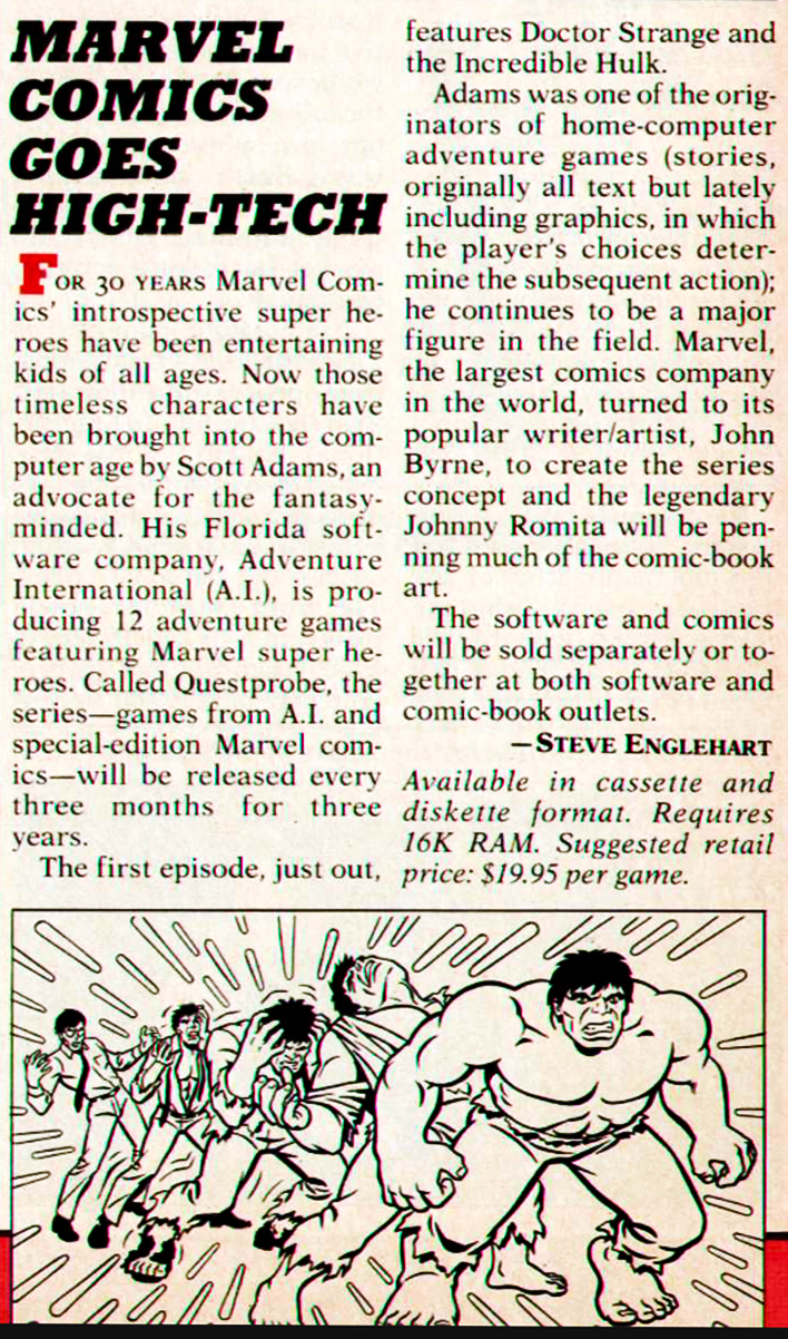 Bár 1982-ben már megjelent egy hivatalosan licenszelt Pókember-játék, mivel az egy konzolos akciójáték volt, félig-meddig joggal ünnepelték az újságok a Marvel kompjúter-korszakba való belépését két évvel később. Az itt beharangozott 12 játékból mindössze három jelent meg, mégpedig a Hulkra, Pókemberre, illetve a Fantasztikus Négyes kevésbé népszerű felére építő darabok. Illusztrált, de szövegesen irányítható kalandjátékok voltak ezek mind, tele meglehetősen ostoba húzásokkal és igen aljas csapdákkal.