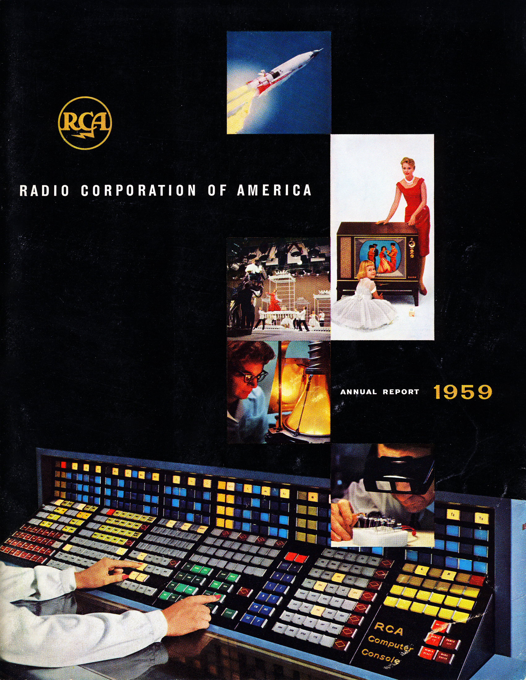 Az évtizedekkel később saját játékkonzollal is előálló RCA 1959-es prospektusa. A fő kép az RCA 501 adatfeldolgozó rendszer színes vezérlő terminálját mutatja be, a kisebb képek pedig olyan vívmányokat ábrázolnak, amelyek az RCA-nak (is) köszönhetők. Legfelül egy RCA-gyártású irányítórendszert használó ICBM-rakéta süvít, alatta pedig a Latham fantázianevű színestévé köré gyűlik a család. A mellett az NBC tévécsatorna egy színes műsorából származó képkocka van, az alatt pedig a cég egyik kutatója vizsgálja a félvezetők gyártására szolgáló egyik berendezést. Az alsó kisképen egy mérnök tanulmányoz egy friss áramkört.