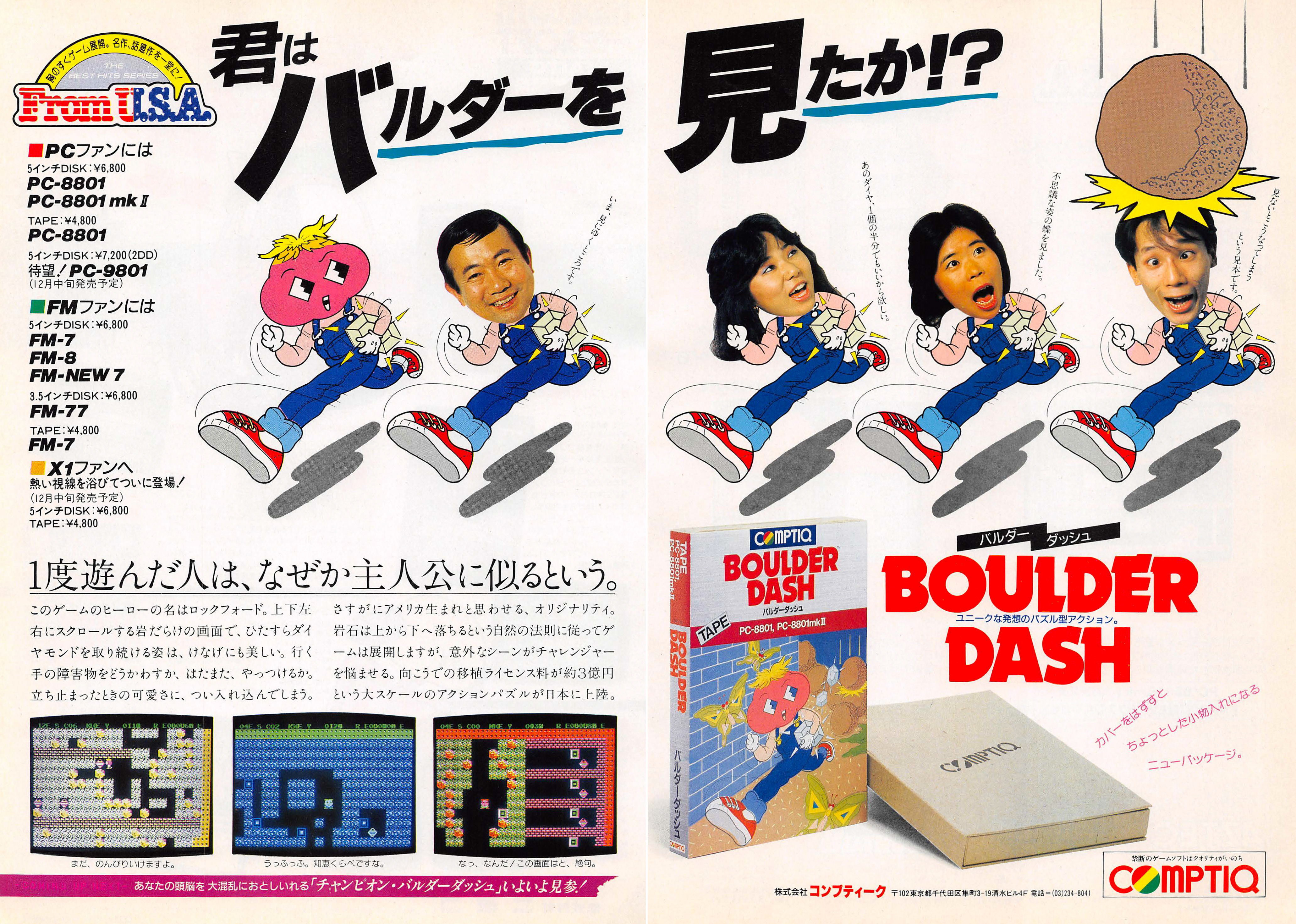 A „From U.S.A.”-sorozat legújabb része egyenesen Kanadából hozza a remek szoftvert, avagy Japán még mindig nem jó földrajzból, viszont néha piszkosul rá tudnak kattanni egy-egy nyugati játékra is. Ilyen volt a Boulder Dash is, amelynek jogai egy általánosan megfogalmazott szerződésnek köszönhetően teljesen átszálltak az első rész japán forgalmazóira, így platformtól függően a Comptiq, a Data East és a Victor Interactive is szabadon és legálisan gyárthatták a folytatásokat a japán platformokra. E hirdetés azonban még az eredeti játékot ábrázolja, méghozzá annak is a különféle japán számítógép-családokra megjelent változatát.