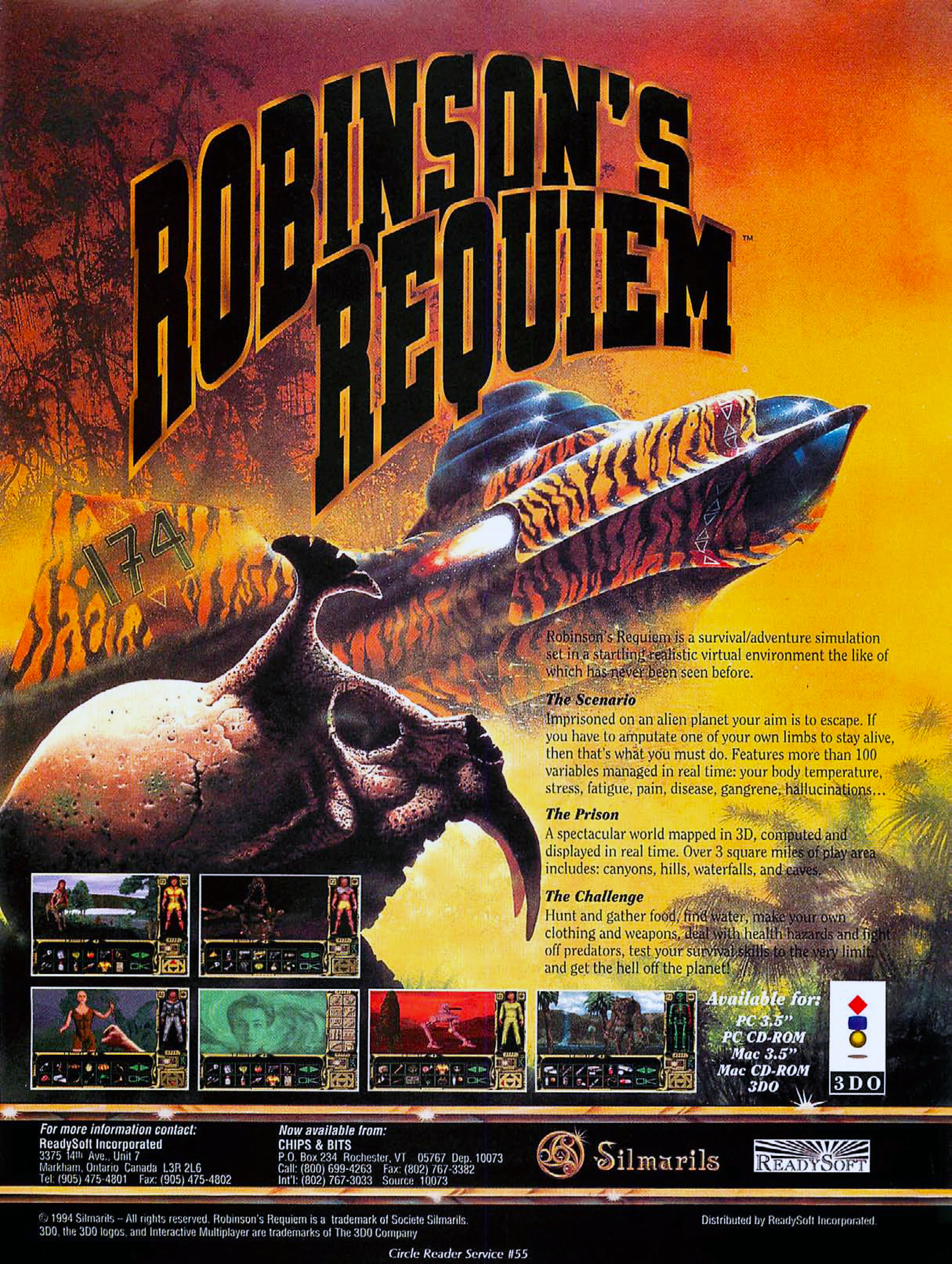 A Robinson’s Requiem nem egyszerűen az egyik első túlélő játék volt, de a mai napig talán a legkeményebb is – a program nem egyszerűen karakterünk éhségét, fáradtságát és szomjúságát vezette, de a francia fejlesztők még a sebek elfertőződését is megpróbálták modellezni. Így aztán, ha karakterünket rozsdás késsel metszik meg, a gangréna-mutató emelkedni kezd, és előfordulhat, hogy az amputálás az egyetlen megoldás. A szabadon bejárható 3D-s világ 1994-ben még kifejezett újdonság volt; igazán kár, hogy a sztori a Silmarils hagyományainak megfelelően semmit nem tudott kihozni az eredeti alapokból.