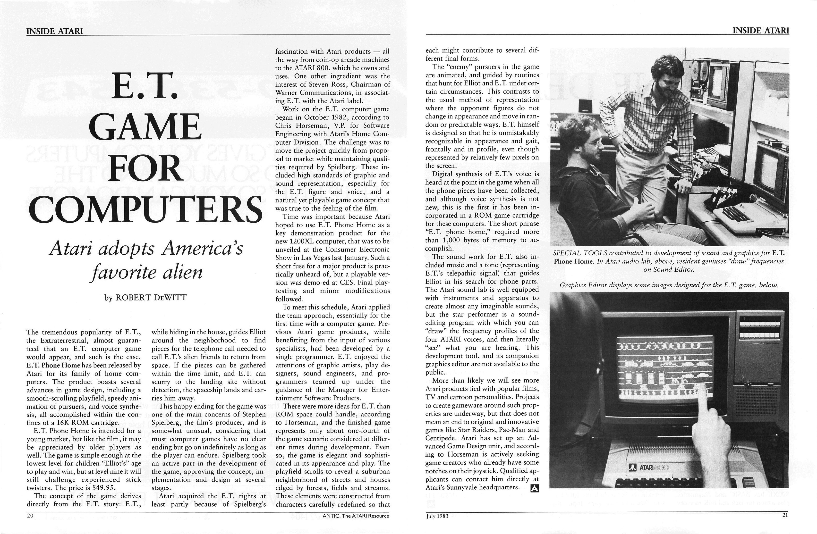 A híres-hírhedt E.T. the Extra-Terrestrial, amelynek a nyakába nem csak az Atari 2600, de egyenesen az első amerikai konzolkorszak teljes összeomlását szokás varrni, 1982 karácsonyára időzítve jelent meg – aztán 1983 szeptemberében már be is ástak az új-mexikói sivatagba jó 730 ezer példányt az eladhatatlan cartridge-ekből. Ez az a sztori, amit a legtöbben ismernek; azonban a két dátum között érthetetlen módon készül egy másik, szintén hivatalosan licenszelt játék ebből a franchise-ból: az E.T. Phone Home! az Atari számítógépeire jelent meg, és bár ez is kifejezetten gyenge volt, észlelhető kárt már nem tudott okozni a már amúgy is enyhén összedőlőben levő cégnek.