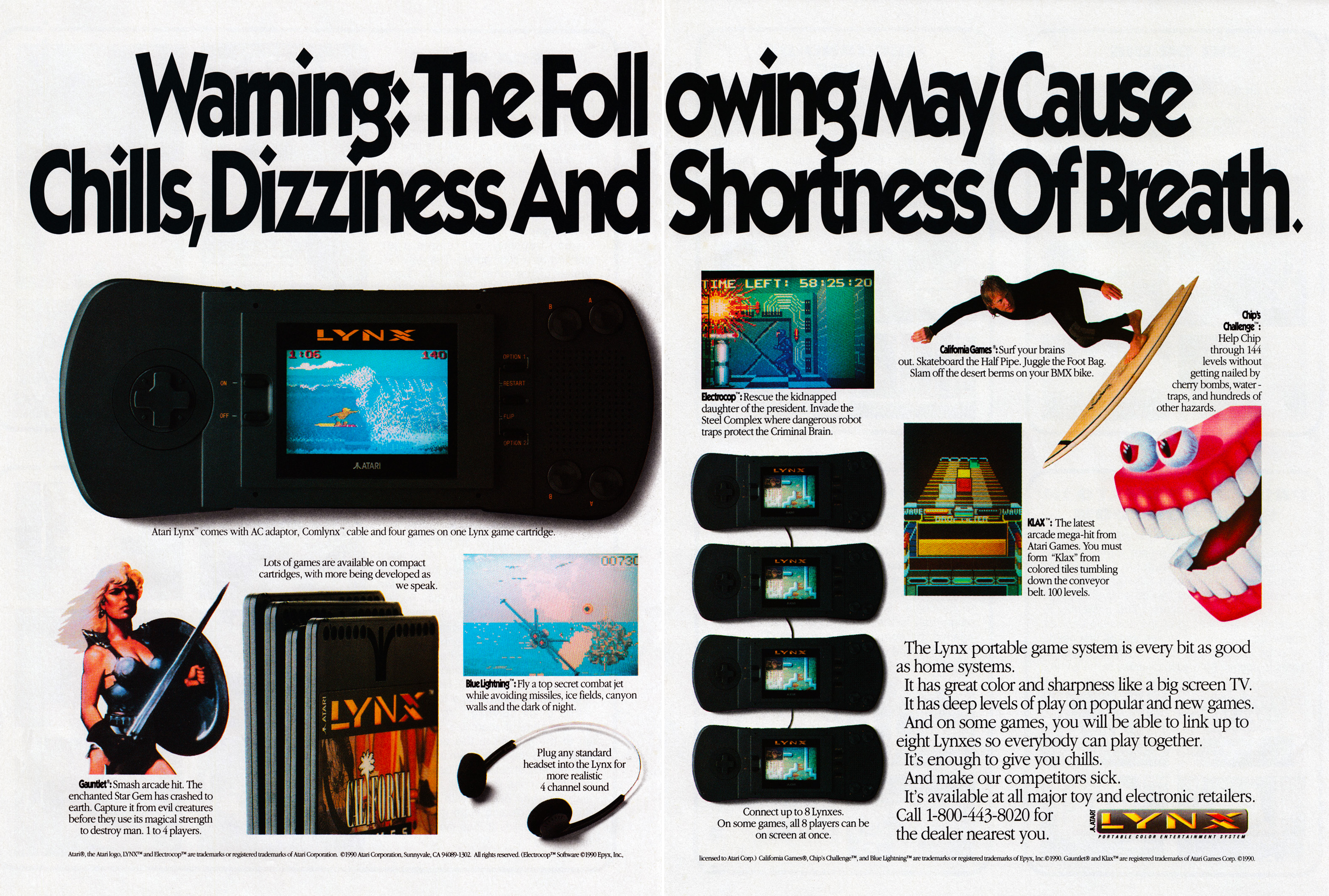 A kilencvenes években az volt a menő, ami veszélyes volt, így tucatnyi játékhirdetés próbált azzal hatni iskoláskorú olvasóira, hogy őrületet, szenvedést és egyéb negatív fizikai tüneteket lengetett be csali gyanánt. Az Atari is erre a lóra tett a Lynx kézikonzol megjelenésekor: a marketing szerint olyan lenyűgöző a konzolszintű játékélmény egy hordozható gépen, hogy attól mindenki megszédül majd. Talán így is volt: a géppel együtt megjelent Blue Lightning fantasztikus technológiai erődemonstráció volt (egy közepes After Burner-klón képében), de ezen, illetve jónéhány jólsikerült játéktermi átiraton felül nem sok izgalmas programot tud felmutatni a konzol. Az itt is hirdetett nyolcfős multiplayer például jószerivel csak elméleti lehetőség volt, hisz azt egyetlen játék használta ki. A terjesztés is botrányos volt: Japánban meg sem jelent a gép, és Európában is csak katalógusból lehetett rendelni, a boltok nem tartották készleten a Lynxet. És ha ennyi csapás még nem lett volna elég, hát az is sokakat idegesített, hogy a gép a hat elemét mindössze négy-öt óra alatt lemerítette, míg a Game Boy négy elemmel is simán bírta 15-20 órán keresztül a gyűrődést.