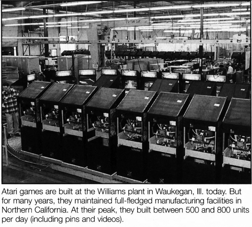 Az Atari egyik nagy összeszerelő üzeme 1990-ben. Az előtérben félkész Pit-Fighter automaták várják a végső tesztelést és ezek sikerét követően a házak lezárását.