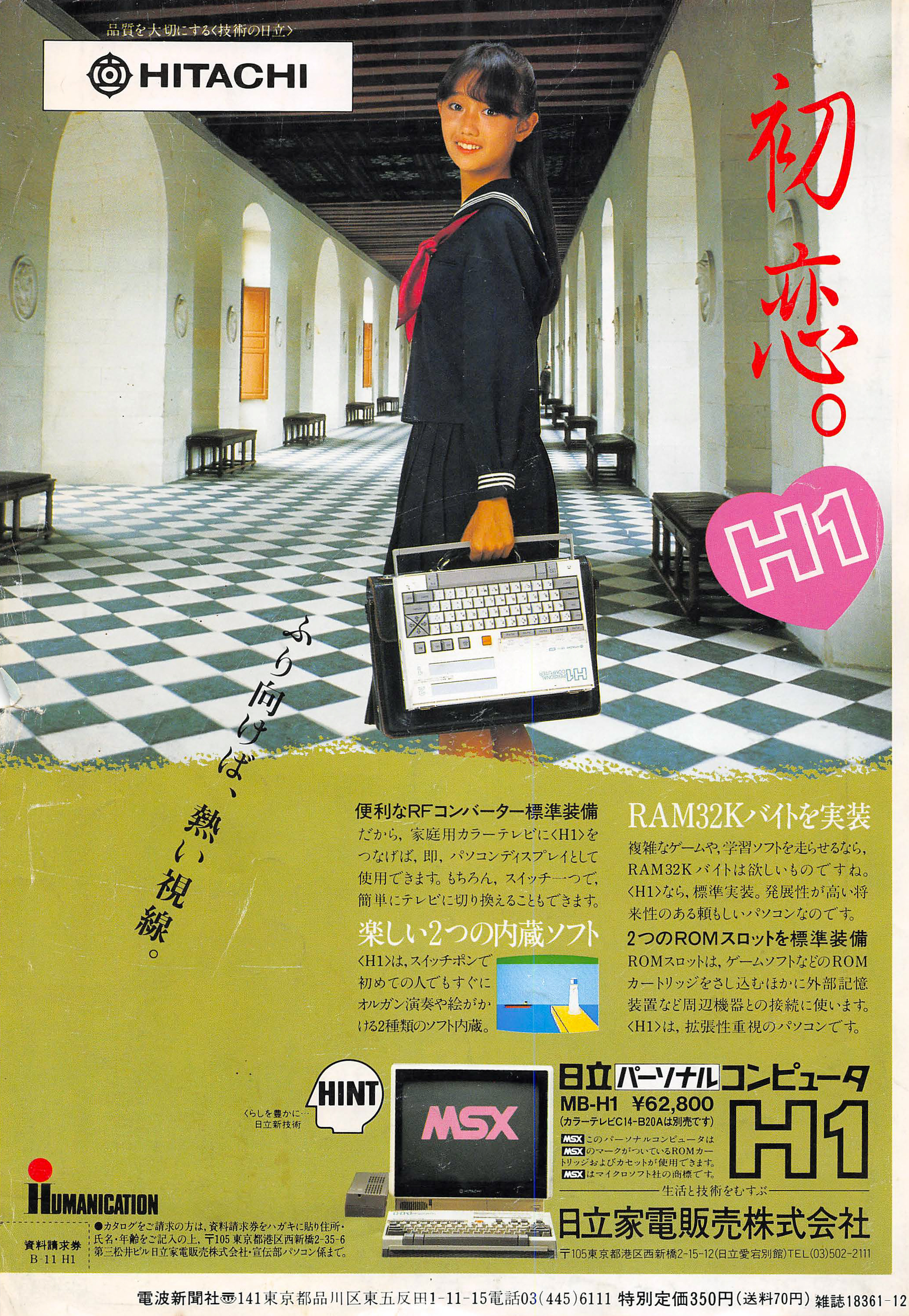 A japán számítógépek mindig is élen jártak a miniatürizáció terén, ám amikor ez nem jött össze teljesen, akkor is szerették könnyen hordozhatóként hirdetni magukat. A Hitachi első MSX-szabványú számítógépe, az MB-H1 azonban tényleg portábilis volt, még egy kis hordozófület is ki lehetett húzni a gépből. Egyetlen dolog nem látszik csak a képen: az óriási külső tápegység, ami nélkül szegény iskolásleányka nem fogja tudni bekapcsolni az „elegáns mandula” színű MSX-ét...