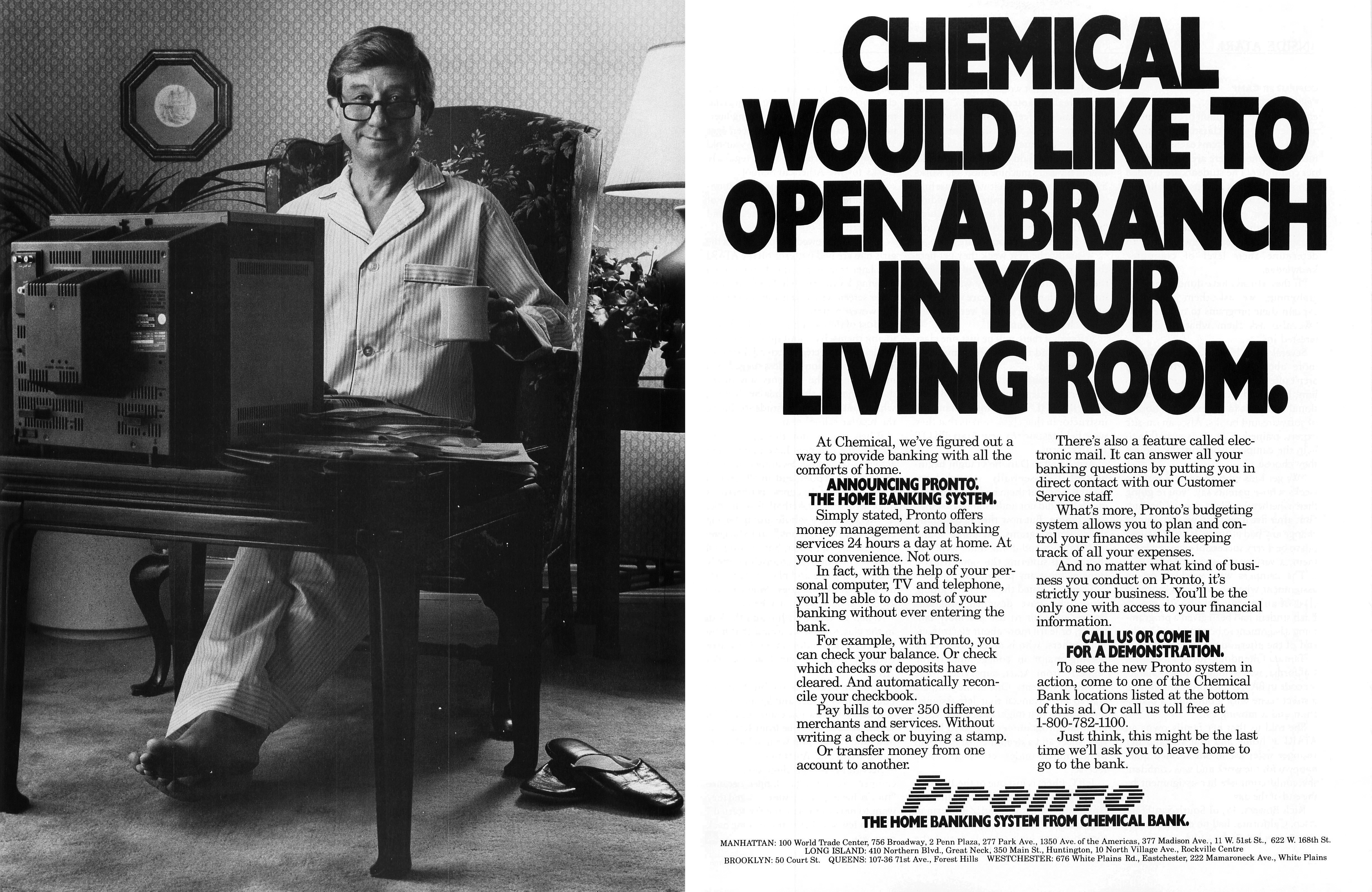Bár számomra rendkívül nehéz volt elhinni, de az első online banki szolgáltatás, az amerikai Chemical Bank Pronto nevű rendszere már 1982-ben elindult. A rendszer eleinte az Atari 400/800 számítógépeket használta, majd további gépekre is kiterjesztették. Mivel a gép mellett nem csak egy modemre volt szükség a Pronto használatához, de egy borsos havidíjat is kellett fizetni a kiváltságért, a rendszer nem igazán terjedt el: egy cikk szerint egy év alatt mindössze 21 ezer felhasználót tudtak szerezni.