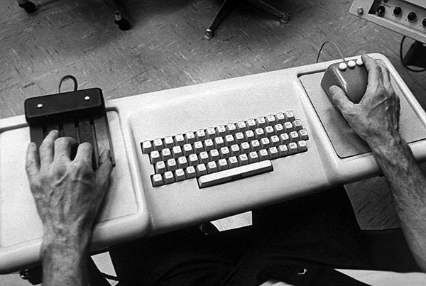 Számítógép-vezérlő rendszer a távoli 1968-ból – Doug Engelbart használta ezt legendás prezentációján, amely lényegében elindította a számítástechnika új, máig tartó „civil”korát. A jobb kéz a világ legelső egerét használja, ami alatt amúgy a világ első egérpadja látszik. A bal kéz egy keyseten nyugszik: ennek öt nagy „gombja” módosította az egér és a billentyűzet gombjainak hatását (lényegében a mai Shift, Alt, Control gombok megfelelője volt, még két opcióval). Az ölben is elférő, a szekrényméretű mainframe-ek korában maximálisan hordozhatónak nevezhető hardvert Jack Kelley tervezte, a Herman Miller cég egyik ergonómus mérnöke.