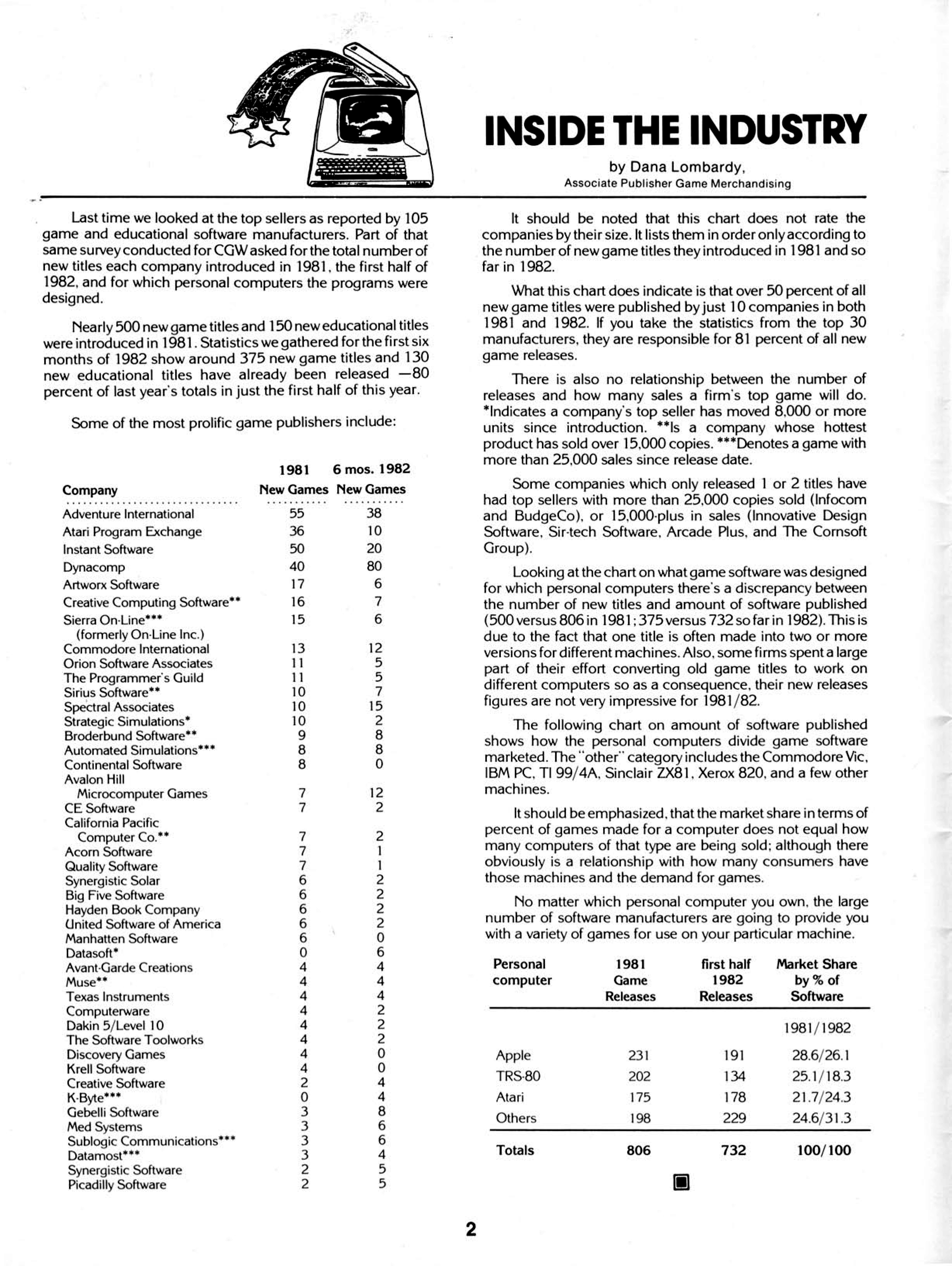Helyzetjelentés az 1982-es amerikai játékiparról, mégpedig bal oldalon a kiadott játékok száma szerint rangsorolva a kiadókat, jobb alul pedig a domináns számítógép-gyártókat az azokra megjelent programok alapján sorba rendezve.