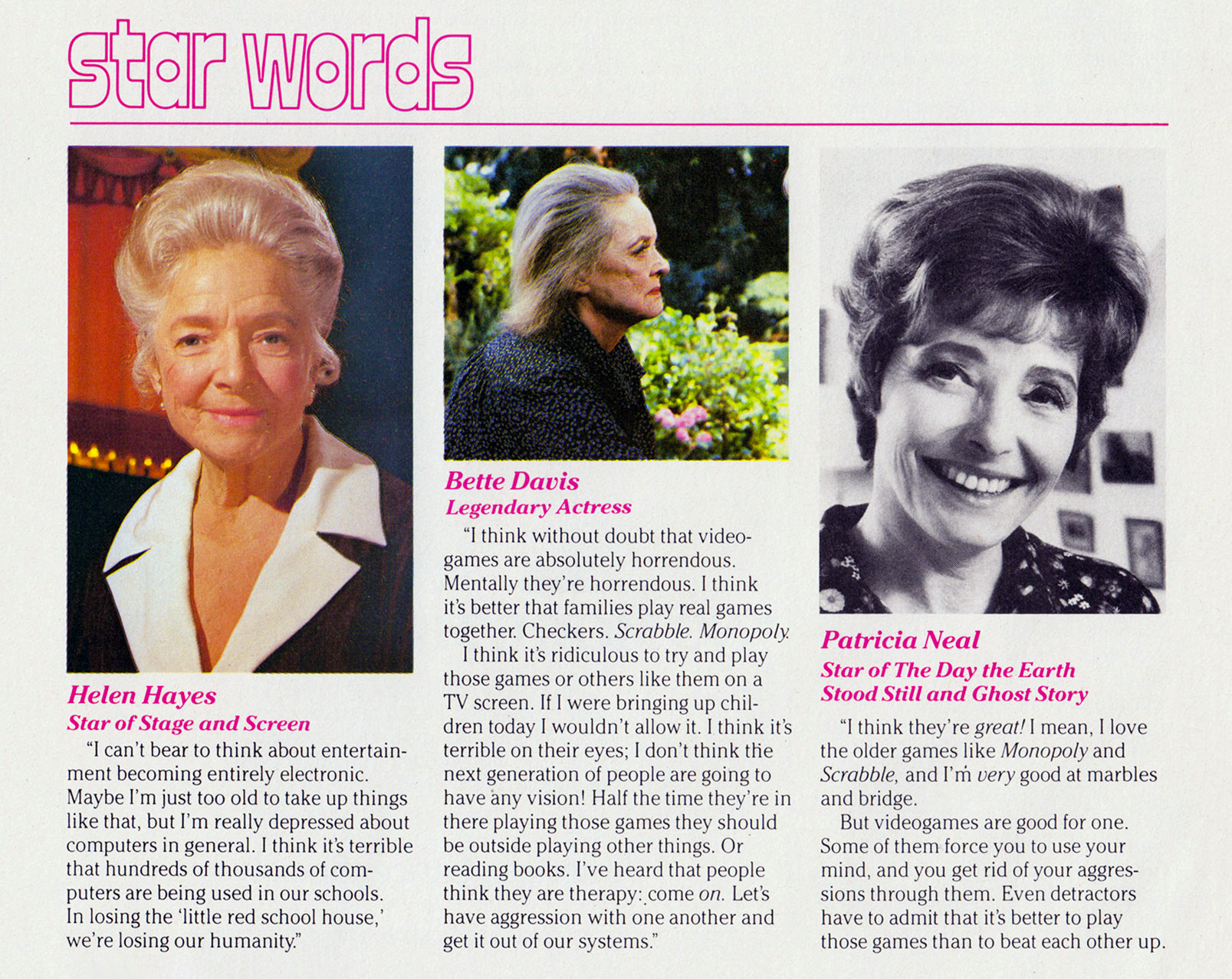 A „kérdezzük meg híres emberek véleményét a játékokról” rovat szerkesztője valószínűleg nem tudta, hogy ennyire depressziós szekciót kell majd vezetnie, amikor elvállalta a feladatot. A legjobb Bette Davis véleménye, aki szerint sokkal hasznosabb lenne, ha a gyerekek egymást vernék a játszótéren, hisz a tévéképernyők előtt jó eséllyel legalább a felük megvakul majd... A gyűjtés 1982-ben készült.