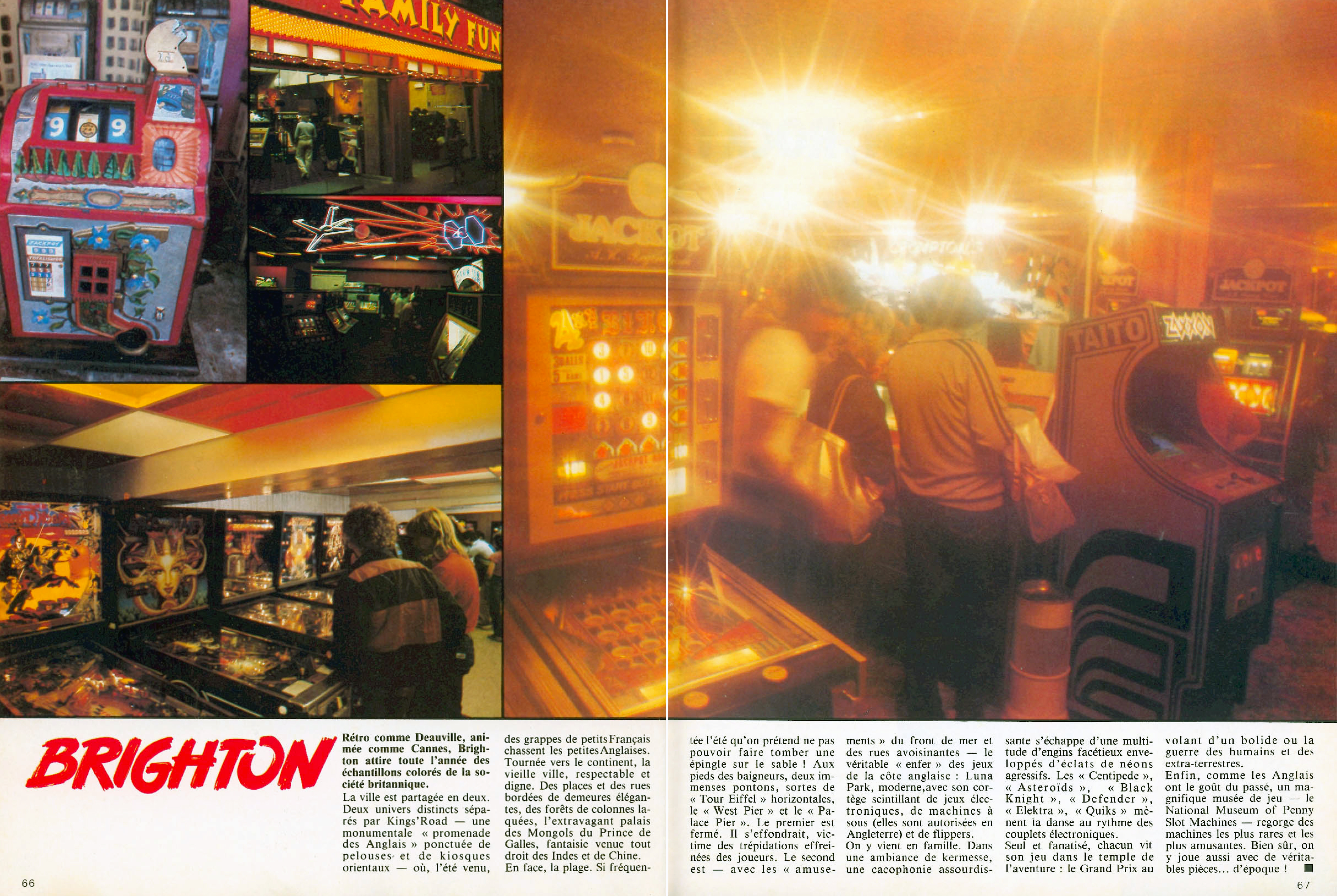 A Tilt magazin egyik – legalábbis retrós szemmel nézve – legérdekesebb cikksorozata az volt, amelyben a világ akkor legjelentősebb videojáték-központjait keresték fel. A kilencvenes években persze már a szerkesztők Japánból és az Egyesült Államokból is rendszeresen tudtak fényképes beszámolókat közölni, de a legelső, 1982 végi szám még „csak” Brightonból jelentkezett. A dél-angol tengerpart egyik legnépszerűbb üdülővárosában rengeteg francia és brit gyerek töltötte nyári szünetét, és persze ezt a tömeget játéktermek egész légiója próbálta meg kiszolgálni már akkor is. A képek a Luna Parkban, a korszak talán legnagyobb európai játéktermében készültek, ahol a legújabb japán játéktermi kabinetek éppúgy megfértek a klasszikus flipperek mellett, mint a gyümölcsös nyerőgépek és a biliárdasztalok.