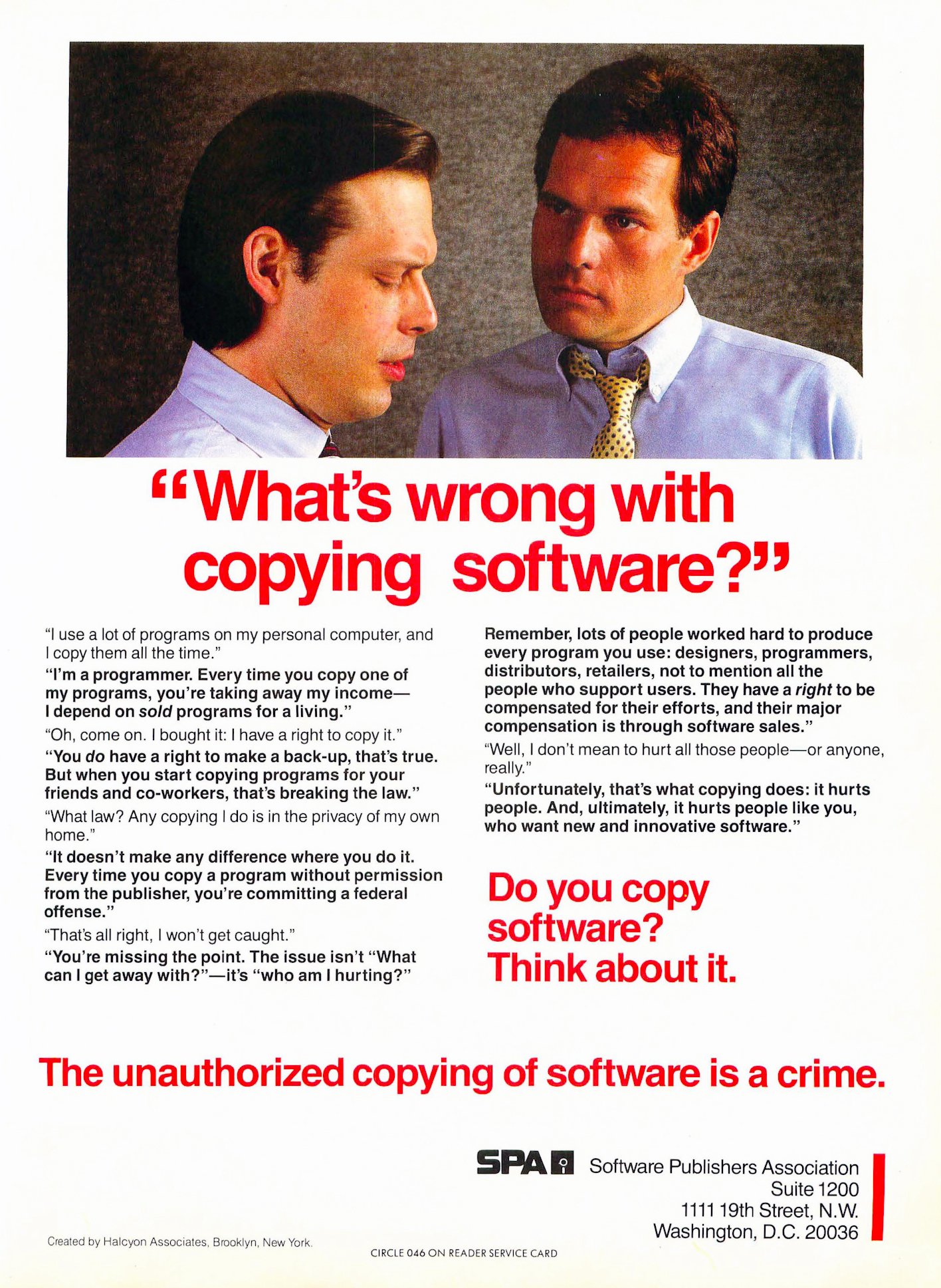 A kép sokkal viccesebb, ha úgy teszünk, mintha a megszeppenten magyarázkodó úr érvelne a kalózkodás ellen, és az iszonyú agresszív arcú, nyakkendőjét a verekedéshez már előre meglazító alak lenne a kérdőre vont warezmágnás...