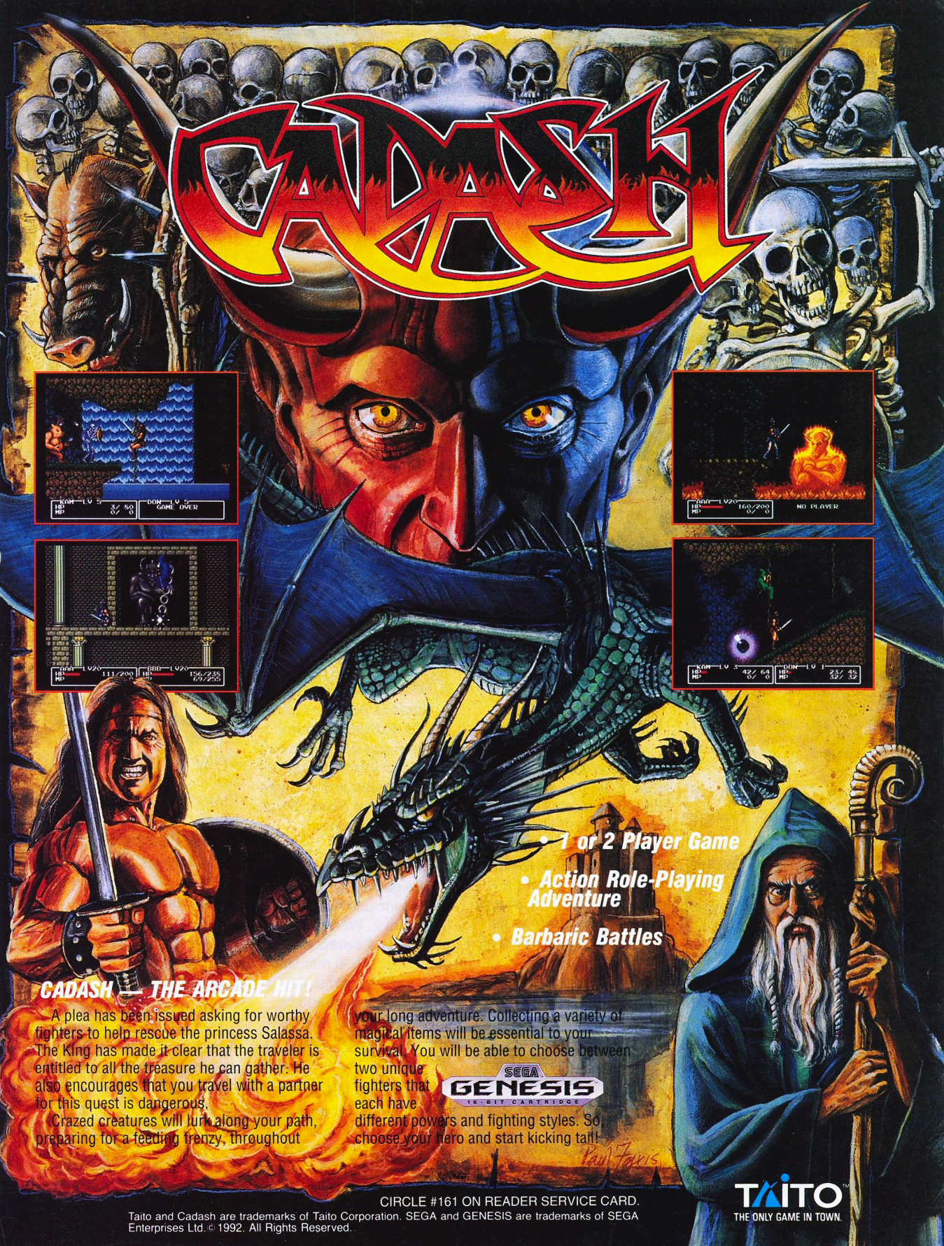 Ha esetleg nem ismernéd fel az ördögszarvas alakot a koponyák gyűrűjében, hidd el, nem vagy egyedül – a Taito grafikusai 1989-ben így képzelték el a Balrogot. Ennél jóval szomorúbb azonban, hogy a Cadash itt hirdetett Mega Drive-verziója alapos kiherélésen ment át az eredeti játéktermi, illetve az azt követő TurboGrafx-16-os kiadásokhoz képest: a négy játszható karakterből csak kettő, a képen is látható barbár, illetve a szakállas varázsló maradtak a programban, és pár főellenséggel is csonkább lett a játék.