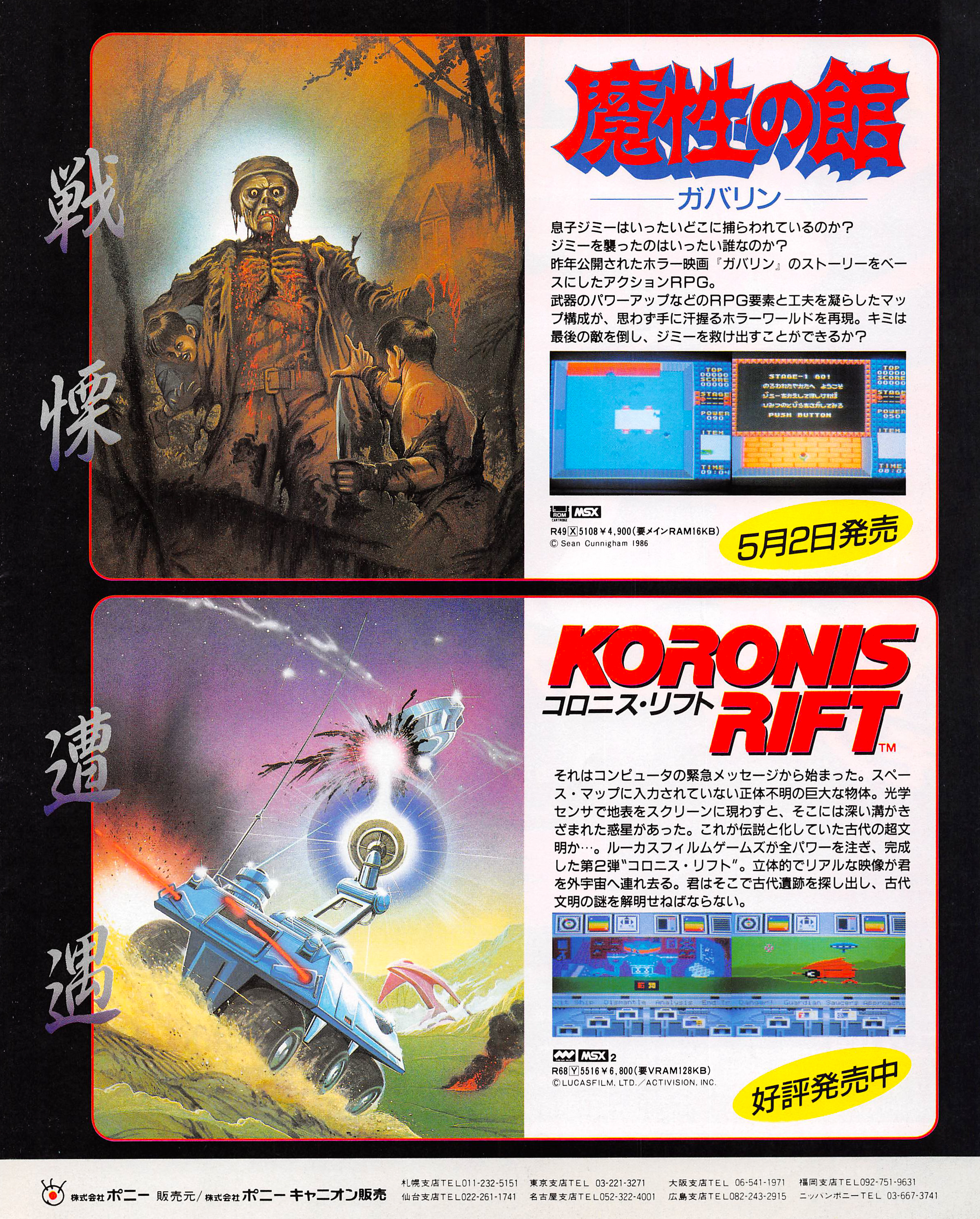 A japán zenei élet egyik legfontosabb kiadója, a Pony Canyon igen hamar belépett a játékpiacra is, és fénykorukban eszelős iramban adták ki a játékokat – mind saját alkotásokat, mind pedig nyugatról importált programokat. Ez a hirdetés is ezt a hozzáállást mutatja: a reklám fele a vietnami háborút zombikkal és családi drámával megbolondító Mashou no Yakata Gabalint próbálja népszerűsíteni, a másik pedig a negyedik LucasFilm Games-játék, a Koronis Rift érdemeit sorolja.
