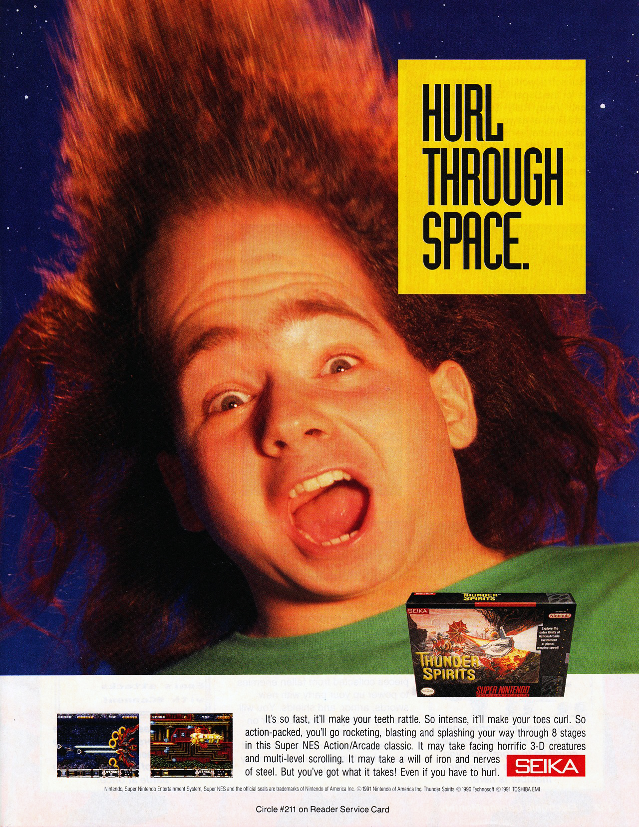 A minden képzeletet felülmúlóan ócska reklám helyett most koncentráljunk inkább a Thunder Spirits kanyargós történetére. A játék Thunder Force III néven kezdte pályafutását, és így talán nem is kellene mondani, hogy egy remek shoot ’em up volt. Az élet megszokott rendjét felborítva a Sega ezt a Mega Drive-játékot ezt követően eladta játéktermi masinaként is – ez volt a Thunder Force AC. Hogy itt hogy került a képbe a Toshiba, azt nem találtam meg, mindenesetre a nem feltétlenül konzolos pályafutásáról ismert cég lehúzott egy harmadik bőrt is a játékról: átírták azt SNES-re, immár Thunder Spirits néven. Igaz, a teljesen új zene gyengébb lett, és persze a tükörsima Mega Drive-verzió után a szaggatás is meglepő volt, de hát sokszor volt ez a sorsa az efféle késői, nem az eredeti fejlesztők által készített portoknak.