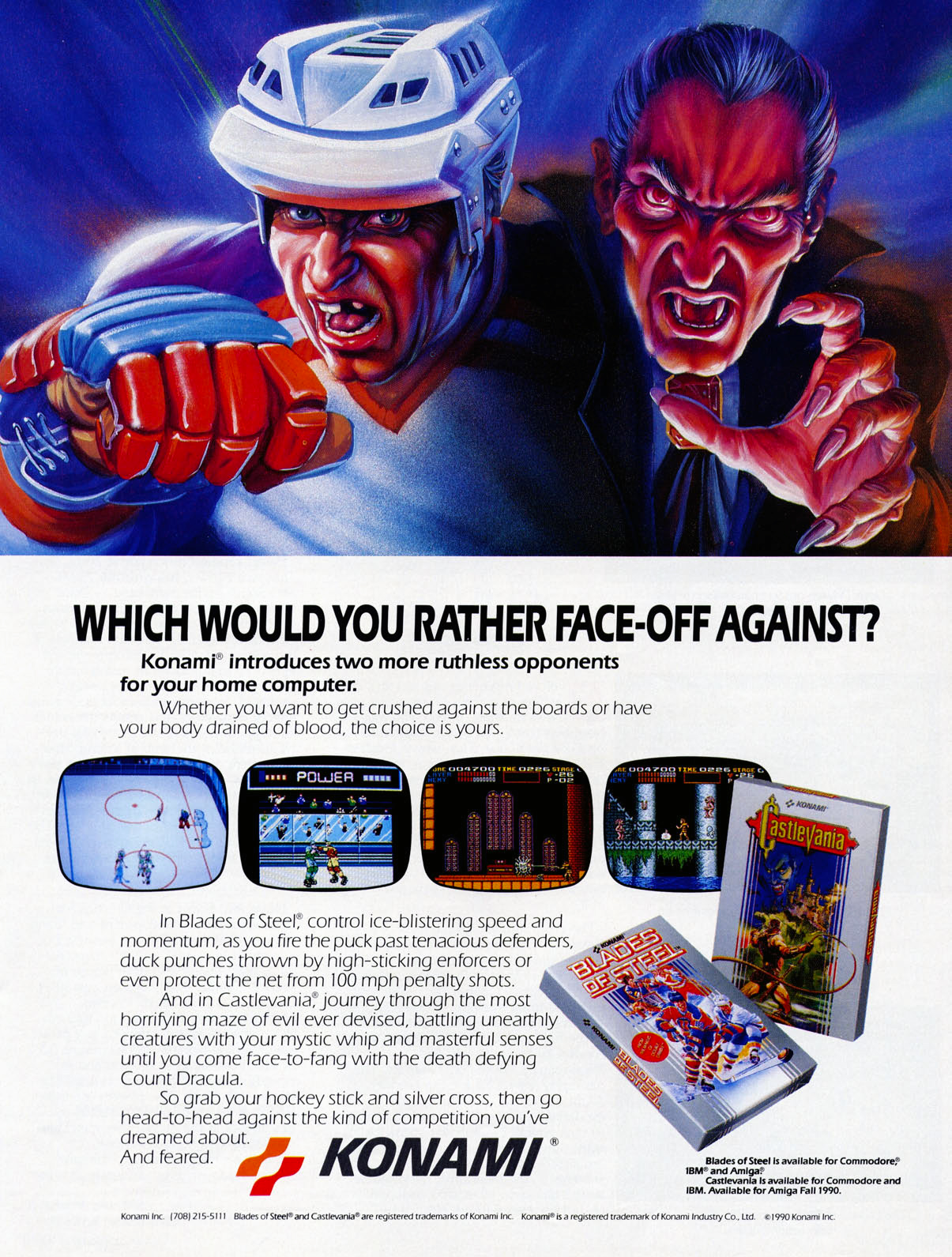 Te mit csinálnál, amikor csak egyoldalnyi reklám kifizetésére lenne büdzséd, ám két radikálisan eltérő játékot kell hirdetned? A Konami marketingesei a lehető legjobb megoldás mellett döntöttek: egy ismeretlen grafikussal elkészítették a nyolcvanas évek egyik legjobb promóciós gépét, amelyen egy kivert fogú hokis és egy megnyúlt fogú vámpír furcsa húsgóleme próbálja rávenni az olvasót a vásárlásra, lehetőleg rögtön kettőre is.