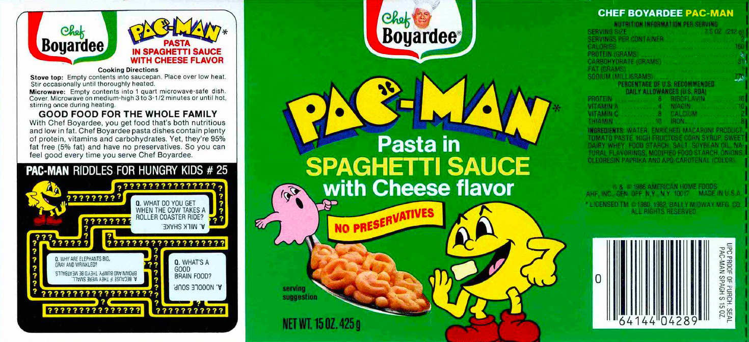A Pac-mánia olyan eszelős méretűvé vált Amerikában, hogy még 1986-ban is megérte licenszelni a karaktert. És hogy mihez? Lényegében bármihez: így kerülhetett a boltokba ez a kifejezetten egészséges alapanyagokból álló konzerv-spagetti (sajtos ízesítéssel!) is...