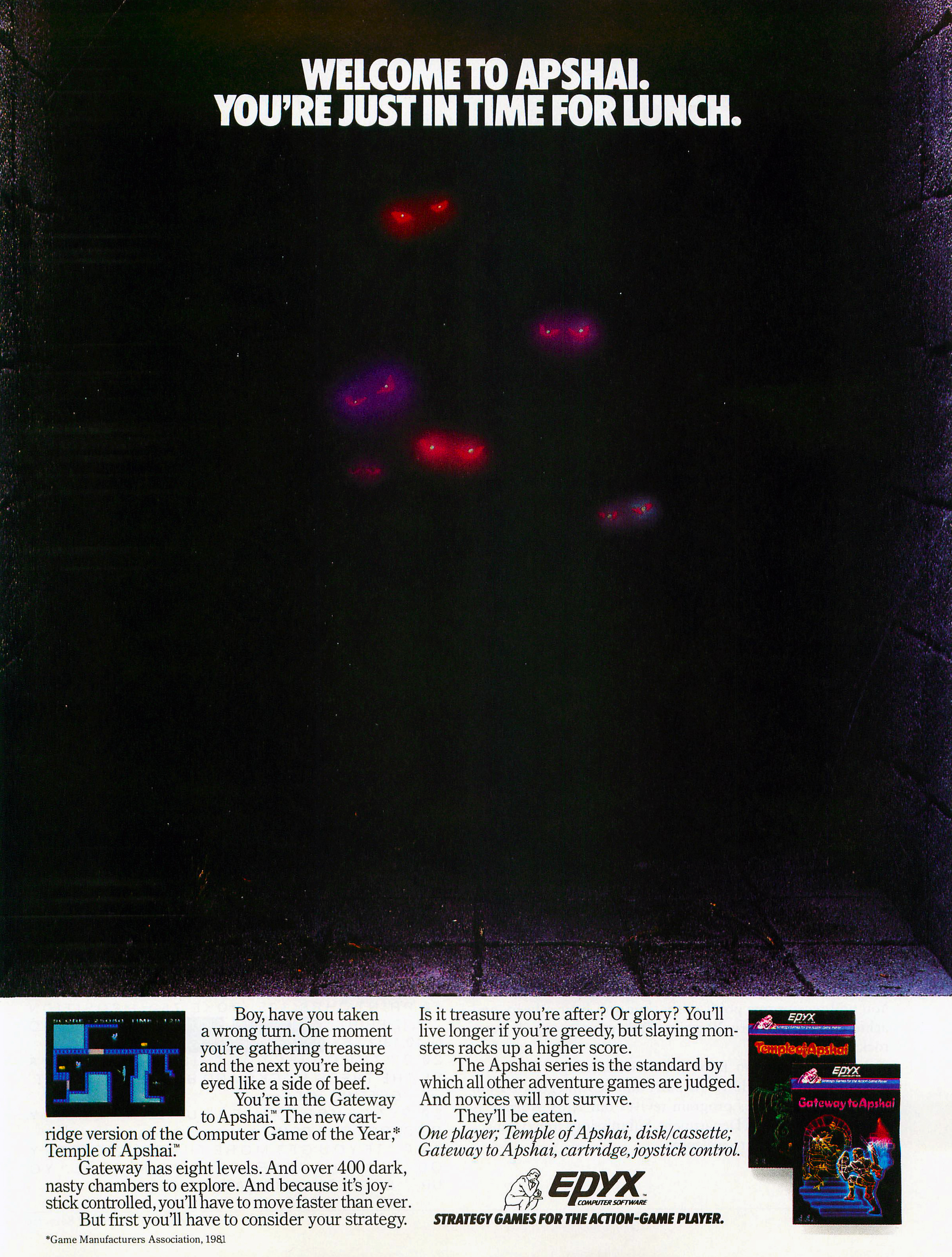 Ez a hirdetés a széria utolsó darabját, az 1983-as Gateway to Apshai-t reklámozza, a korhoz képest meglepően hangulatos módon. Sajnos ez nem egy igényes lezárás volt, hanem egy gyengécske, rosszul irányítható akciójáték, amely értelmezhető sztori híján csak a pontgyűjtésről szólt.