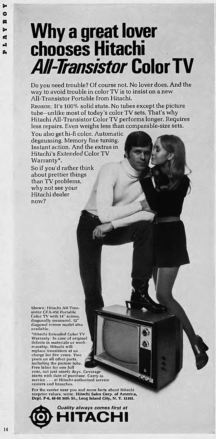 A „mondd meg anyádnak, hogy ha igazán szeret, ilyen csokit vesz neked” kicsit felnőttesebb párja: „ha tényleg nagyszerű szerető vagy, egész biztosan Hitachi-tévéd van”. Azt mondjuk nem teljesen értem, hogy a garbós szerető miért tiporja így tranzisztorokkal teli csodálatos készülékét, de láthatóan a felajzott hölgyet nem zavarja ez a barbár viselkedés...