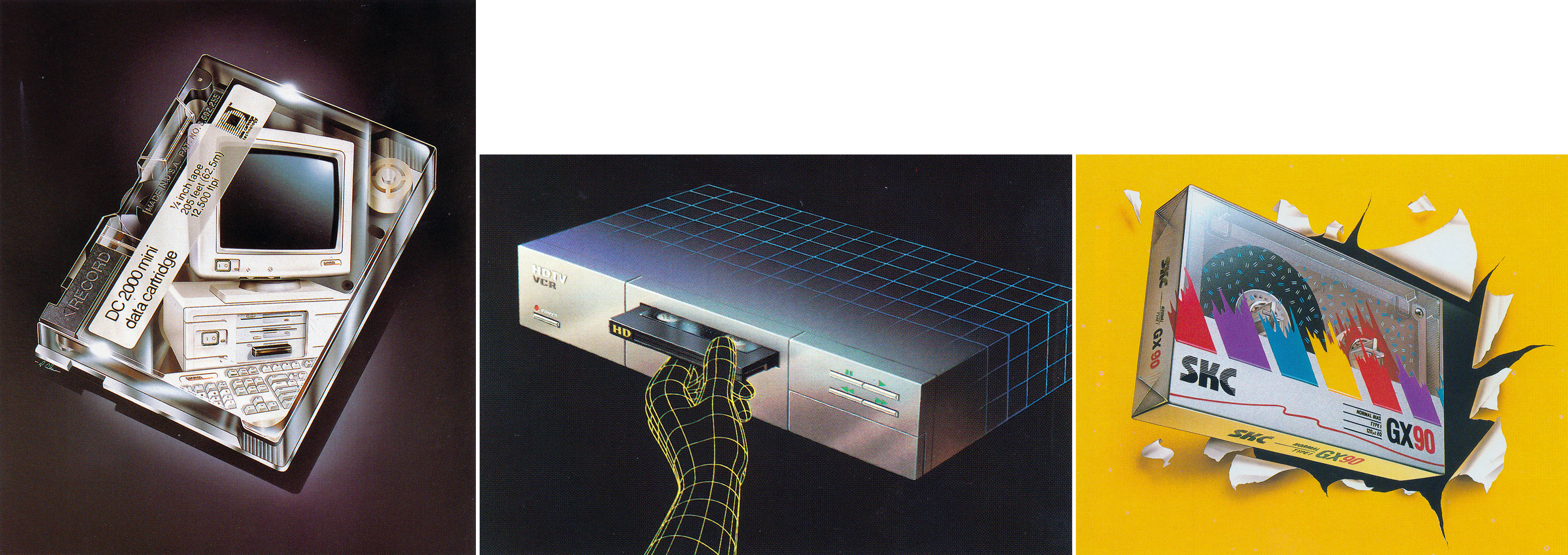 Mielőtt a fényképezőgépek (és a nyomtatók meg a képszerkesztő programok) olyan szintre fejlődtek volna, hogy minőségi termékfotókat lehetett volna készíteni, a leglátványosabb hardverképeket a fotorealisztikus stílusban alkotó illusztrátoroknak köszönhettük. Ezek a képek három eltérő kazettatípust mutatnak be a kilencvenes évekből. Az első festményen egy minicartridge nevű formátum látható, amelynek alaptípusa 40 MB memóriát tárolt a mágnesszalagon. Középen egy D-VHS kazettát helyeznek be egy akkor még nem is létező lejátszóba – a kép 1995-ös, az első meghajtók pedig csak három évvel később kerültek a boltokba. A harmadik festmény egy klasszikus audiokazettát ábrázol, mégpedig a piacot a XXI. században már domináló dél-koreai SKC gyártmányát. A festmények alkotói sorban: Doug Archer, Dale Gustafson, illetve Wil Cormier.