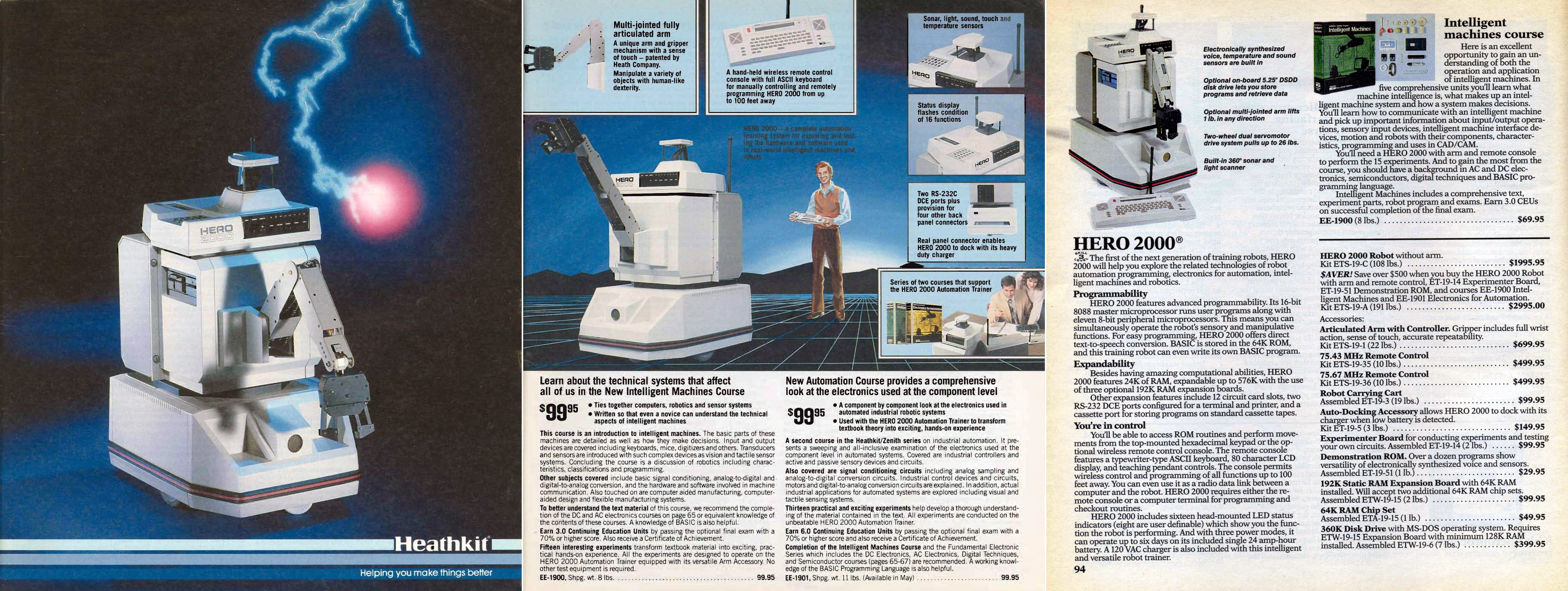 Ahhoz képest, hogy a nyolcvanas évek – mai szemmel – rém kezdetleges technológiájával minden ambíciózus projektet megpróbált valóra váltani az igazi mesterséges intelligenciától kezdve a beszédszintetizálásig, a robotok valahogy sosem kerültek a közfigyelem előtérbe. Pedig léteztek: tucatnyi eltérő, programozható, otthon használható jószág állt az ilyesmire fogékonyak rendelkezésére. A legsikeresebb ezek közül a Heathkit cég által gyártott Hero-sorozat volt, amelynek három generációjából összesen 21 ezer darabot tudtak értékesíteni. A képen a szériát záró, 1986-ban megjelent Hero 2000 robot egyik részletes hirdetése látható.