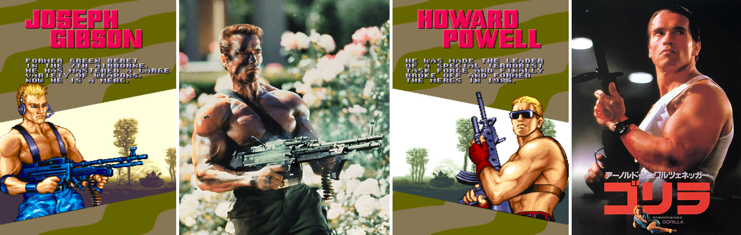 A nyolcvanas években a játékfejlesztők nem voltak gátlásosak a filmes inspirációk nyilvánvalósága terén, e képek például a Capcom által fejlesztett Mercs játéktermi verziójából származnak, mellettük pedig az őket egyértelműen ihlető Arnold Schwarzenegger pixelről pixelre lemásolt, de persze átalakított arcszerkezetű pózai láthatók. Az első testhelyzetet a Kommandóból lopták a grafikusok, a másodikat pedig a Raw Deal japán poszteréről. A legjobb dolog ebben az egészben azonban az, hogy utóbbi, a nálunk Piszkos alkuként ismert film címe Japánban Gorilla volt...