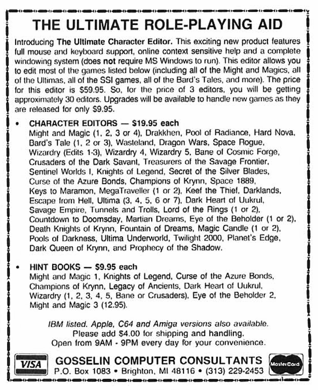 Ha az ember a kilencvenes években csalni akart, akkor vagy kitanulta a 16-os számrendszert és a mentett állások file-jainak hex-editálását, vagy a zsebébe nyúlt. Méghozzá jó mélyen, mert ahogy e hirdetésből is látszik, bődületesen drágák voltak ezek a karakterszerkesztő csalóprogramok. Amikor ez a reklám futott, egy vadonatúj, csúcskategóriás RPG legfeljebb 45 dollárt kóstált, ehhez érdemes mérni a Gosselin Computer Consultants árait.