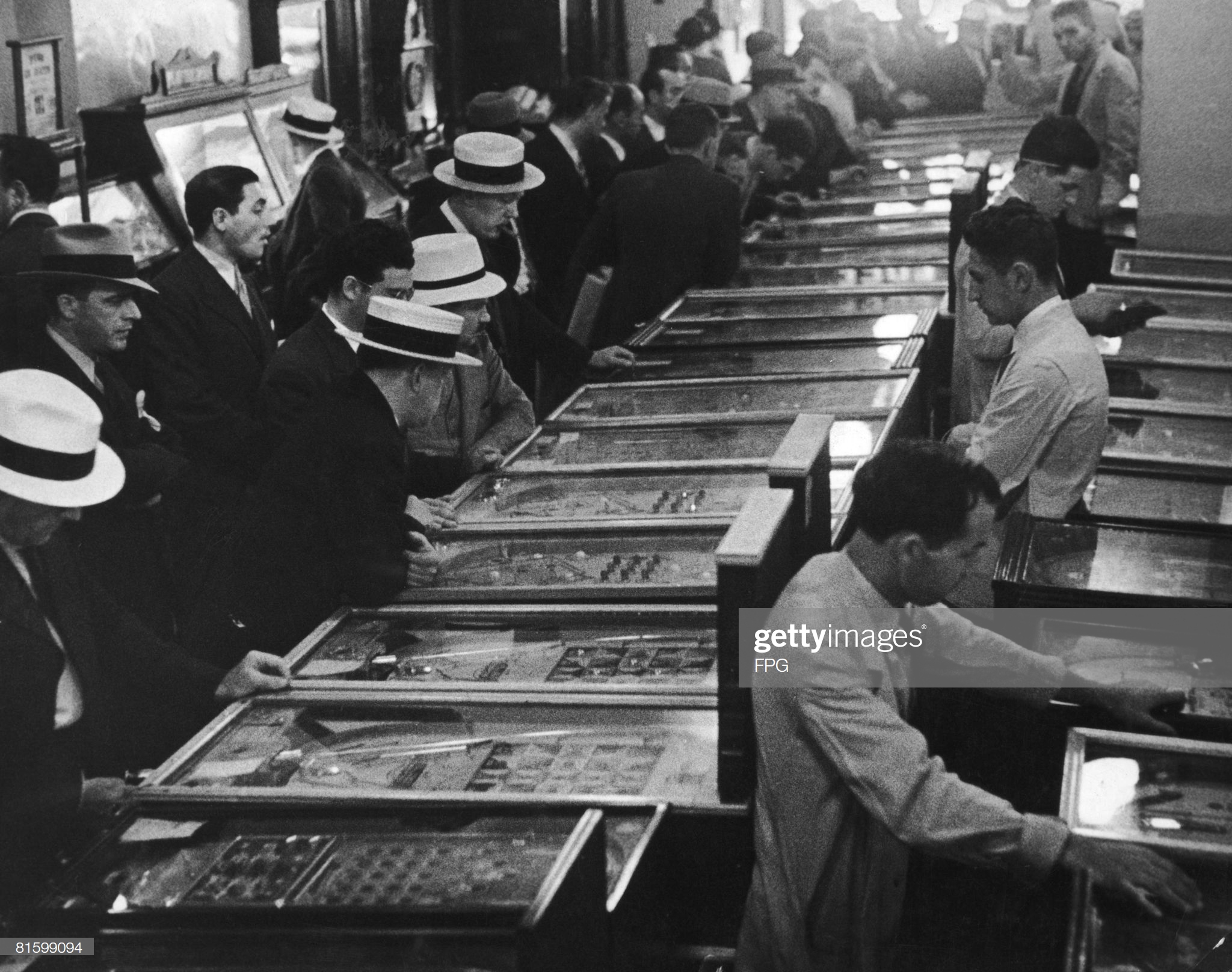 Játékterem Amerikában, valamikor 1935-ben. A manuálisan pöcögtethető flipperkarokat csak egy 1947-es asztal, a Humpty Dumpty vezette be, addig a játékos feladata mindössze az volt, hogy a kilőtt golyók a játéktér különféle zsebeiben landoljanak. A japán pachinko valószínűleg ezekből az ősi flipper-előzményekből alakult ki.