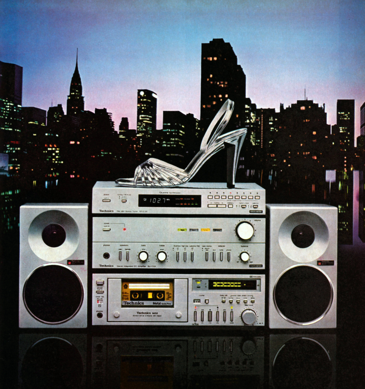 Ha az ember kazettásmagnót akar a Vogue magazinban hirdetni, nem támaszkodhat a megszokott futurisztikus űr-illusztrációkra, valahogy szexivé kell tenni a hardvert. A Technics szakemberei ezt egy éjszakai fotóval és egy levetett ezüsttopánkával oldották meg.
