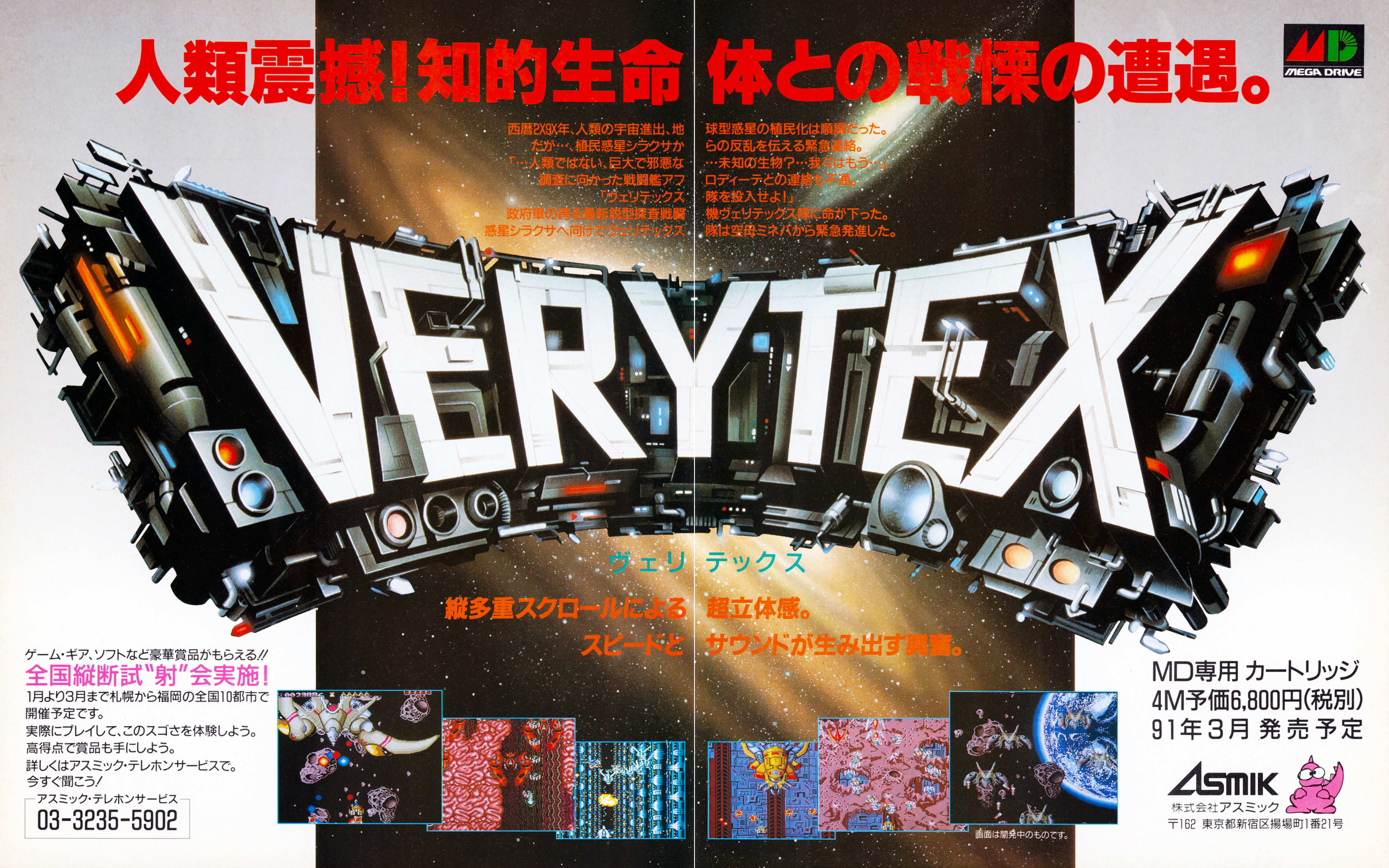 Bár nyugaton sem kellett szűkölködnünk Mega Drive-os shoot ’em upokban, Japánban a kilencvenes évek első felében jószerivel minden hónapra jutott egy-két újabb megjelenés. Ezek közül a jobbak, vagy legalább a sikeresebbek megkapták a nyugati megjelenés lehetőségét is; így aztán már tudjuk is, hogy errefelé miért nem hallott senki a Verytexről. Az Opera House és az ISCO stúdiók által közösen fejlesztett függőlegesen scrollozó programot én magam sosem próbáltam, de minden beszámoló egyetért, hogy ez nem hiba: hat pályája során állítólag semmi eredeti ötletet nem tud felmutatni. Ezt készséggel el is hiszem, a logója viszont parádésan jó, úgyhogy ezt a hirdetést nem tudtam nem megosztani!