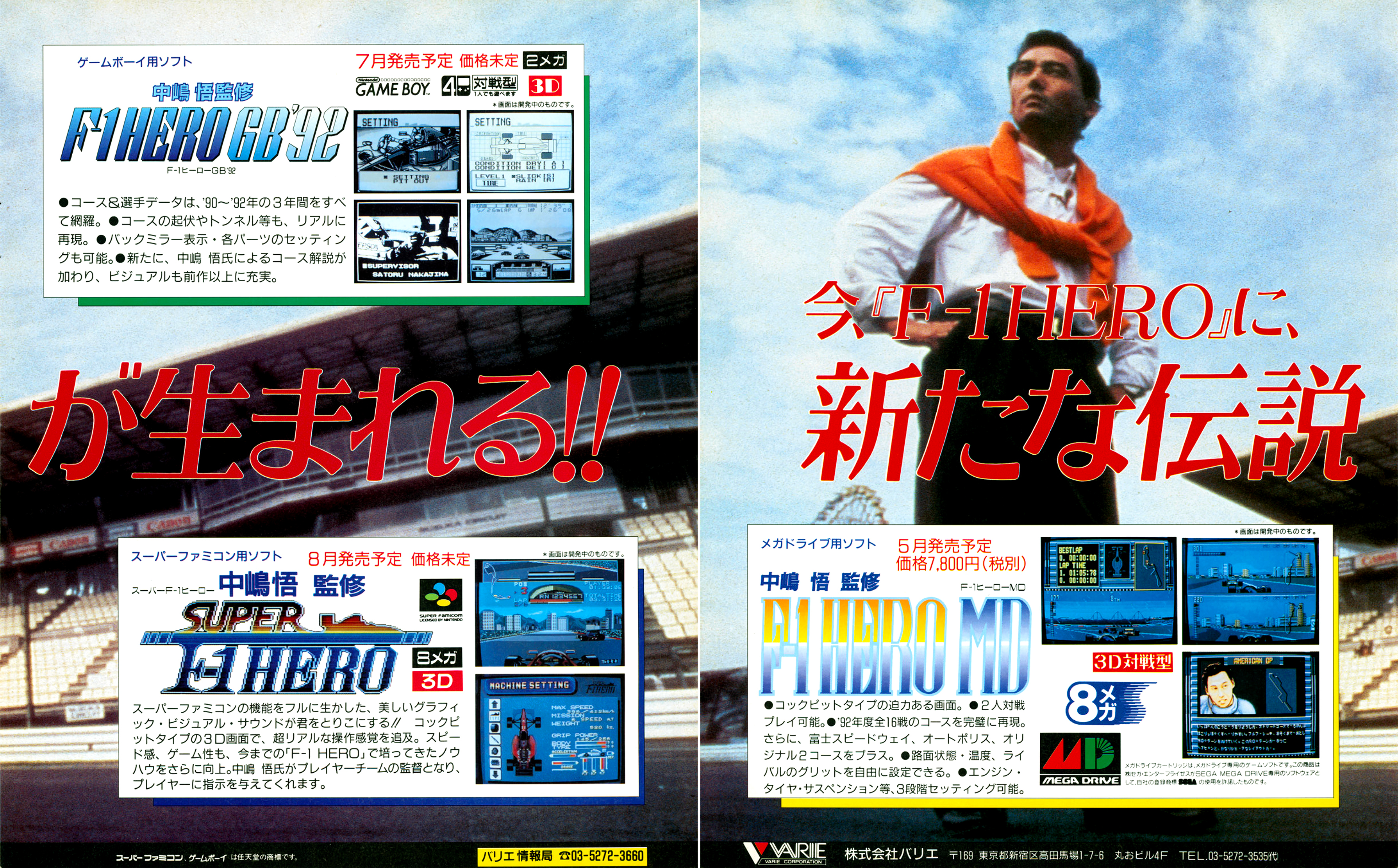 Bár Satoru Nakajima sosem nyert futamot, a kilencvenes évek fordulóján ő volt az egyetlen japán pilóta a Forma-1-ben, így természetesen hivatalos videojátékot is kapott. A szinte kizárólag versenyjátékokat készítő Varia dolgozott ezen, a korszak három legfontosabb platformját ellátva az F-1 Hero különféle átirataival.