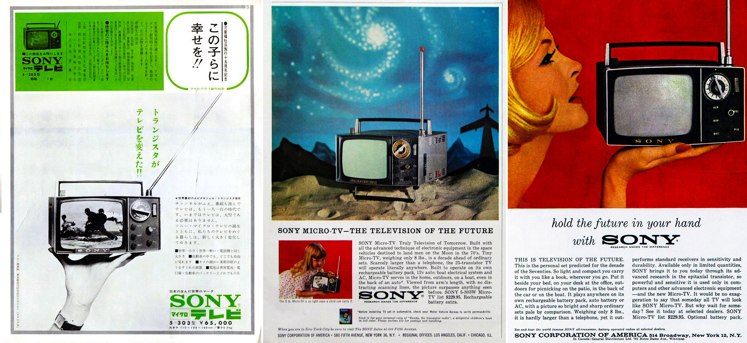 A Sony egyik korai sikerterméke az 1963-ban piacra dobott 5-303W Micro-TV volt, egy viszonylag olcsó és viszonylag hordozható tévé, amely mind hálózatról, mind saját akkumulátorával üzemeltethető volt. Mérete ma már talán megmosolyogató, de mivel másodlagos (túrázásra vitt, esetleg gyerekszobába való) készüléknek tervezték, a nyolc inch-es átmérő is elégnek bizonyult.
