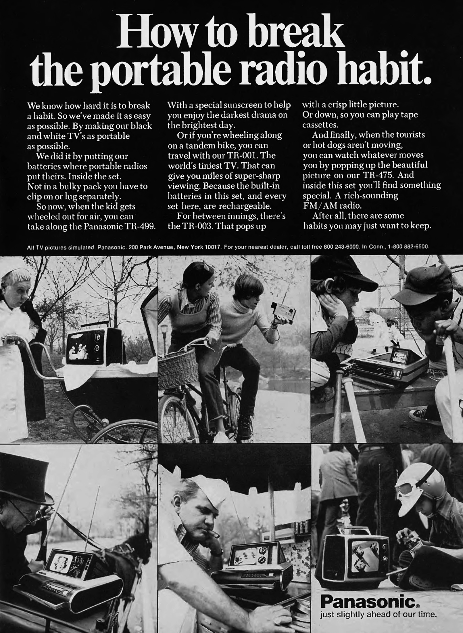 Hordozható Panasonic tévék a hetvenes évek legelejéről: a TR-001 modell a maga másfél inch-es átmérőjével tényleg könnyen cipelhető volt, igaz, sok vizuális örömet vélhetően nem okozott.Forrás: Playboy 1972/10. Állandó link a bejegyzéshez.