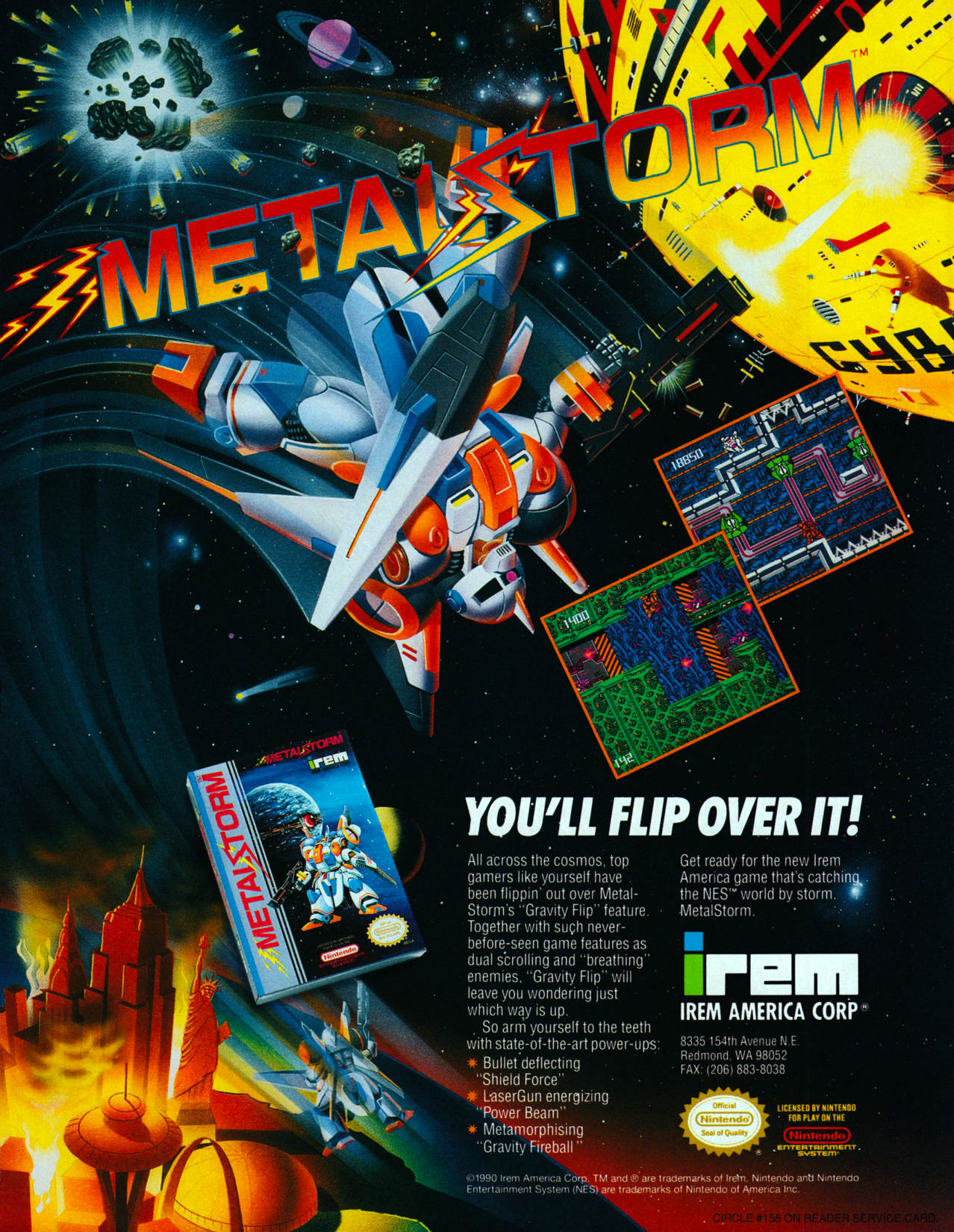Minden idők egyik legjobb játéknevére az Irem csapott le először: igazán kár, hogy a MetalStorm nem lett jóval ismertebb. A japán cég NES-es játékai közül mindenképpen az egyik leglátványosabb és leginkább fair akciójáték még ma is tökéletesen játszható, a gravitációt a feje tetejére állító szuperképesség pedig egyenesen megelőzte korát, annyira dinamikusan használható.